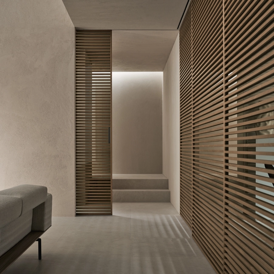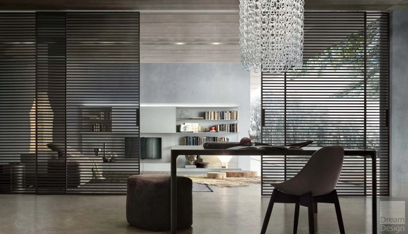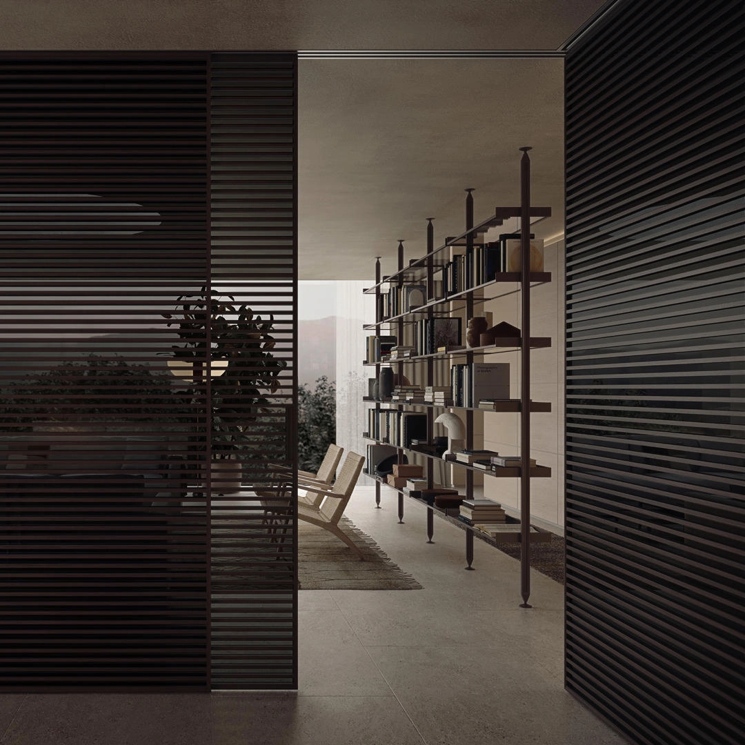 The typical aluminium crosspieces are installed on both sides of the panels, making them perfectly double-sided and ideal for any section of the house, from living to night areas, as well as for professional settings. A high graphic value solution, where the horizontal crosspieces give rhythm to the light passing from the glass panel with always different results.