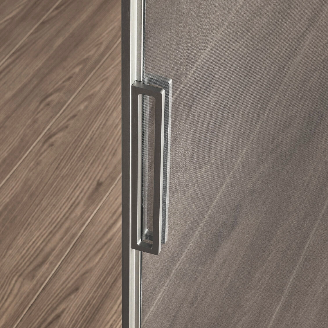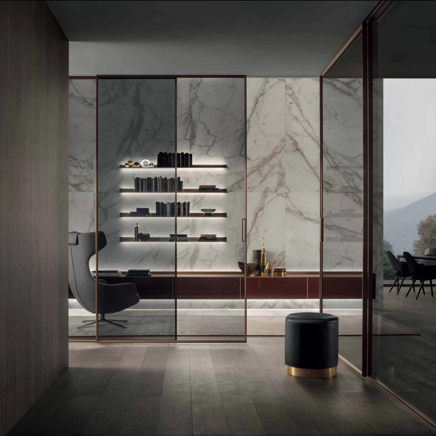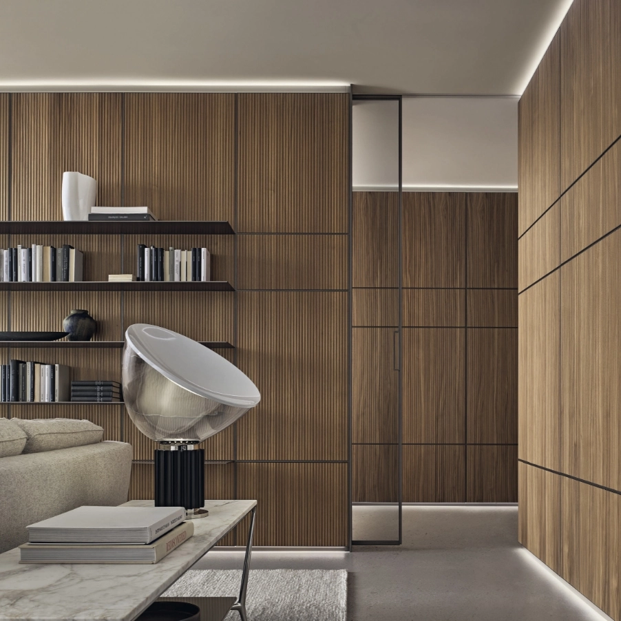 Sliding doors interpreted with the utmost geometrical rigour. In the project panels are always custom made with a structural profile in minimum thickness aluminium that makes the most of the exclusive aesthetic features of Rimadesio glass.
