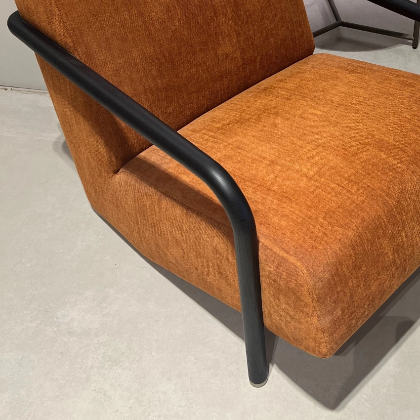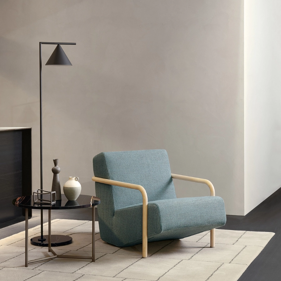 The small Lullaby lounge chair, with its unusual con guration and inclination, evokes the comfort and the act of cradling. Its immediate and pleasant-sounding name is almost onomatopoeic: the “L” recalls the shape of the wooden legs, while “U” identi es the couch on the floor plan, in addition to recall a rocking motion. Small object of desire with an off- plan shape that captures the gaze despite its small dimensions. Lullaby reveals sophisticated details behind its apparent simplicity, such as the small supporting foot in cuvée painted metal, the ash solid structure and the covering in soft fabric, leather or ecoleather. This is a particular homage by Porro and the designer to the Bauhaus and its diktat of reconciling functionalism and formal purism, in an ideal fusion of artisanal artistic creation and industrial production.