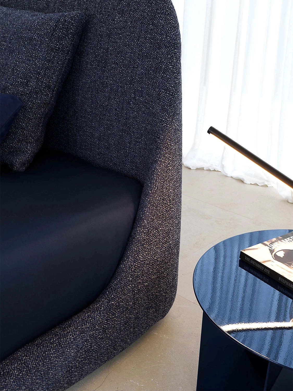 A double-size bed designed for extremely deep mattresses. A curved line forms the soft headboard, without continuity. Taormina was developed to offer customers a double-size bed for large mattresses that are deeper than standard. The shape of the bed clearly suggests relaxation and intimacy. The proportions of Taormina have been carefully studied to give the right emphasis to the comfort of the mattress without exaggerating the height, and furnish the bedroom with harmony and elegance. There is no continuity between the headboard and the bed base. Its soft generous and welcoming curve is highlighted by the exposed stitching along the edges.