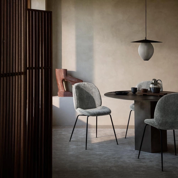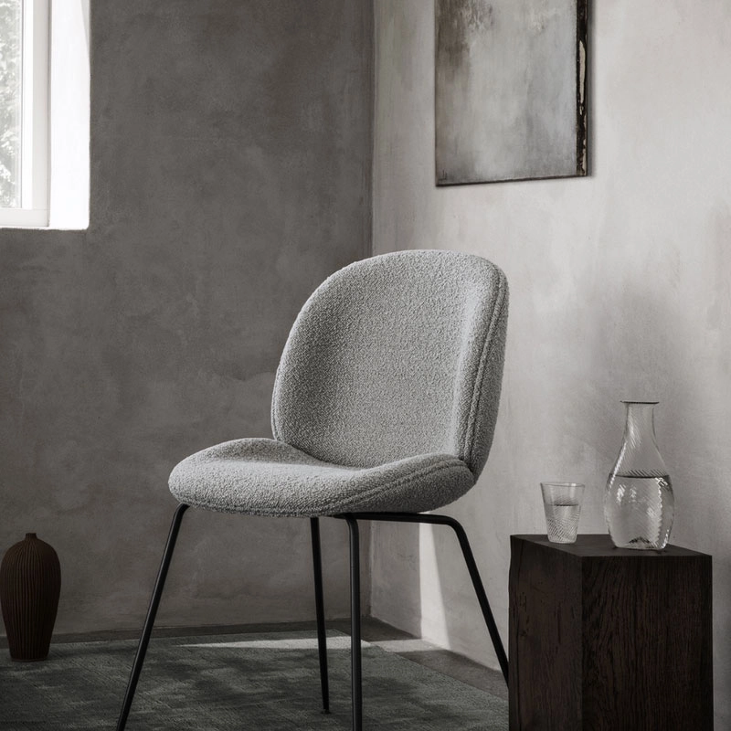 The Gamfratesi studio consists of Denmark’s Stine Gam and Italian Enrico Fratesi. Their work combines different influences, from classic Italian design to Scandinavian traditions. The Beetle chair is inspired by the shape of the scarab. The seat and back are made from two padded shells with curved lines that look like the insect's shell. The slim, tapered steel legs make reference to a beetle's le ...