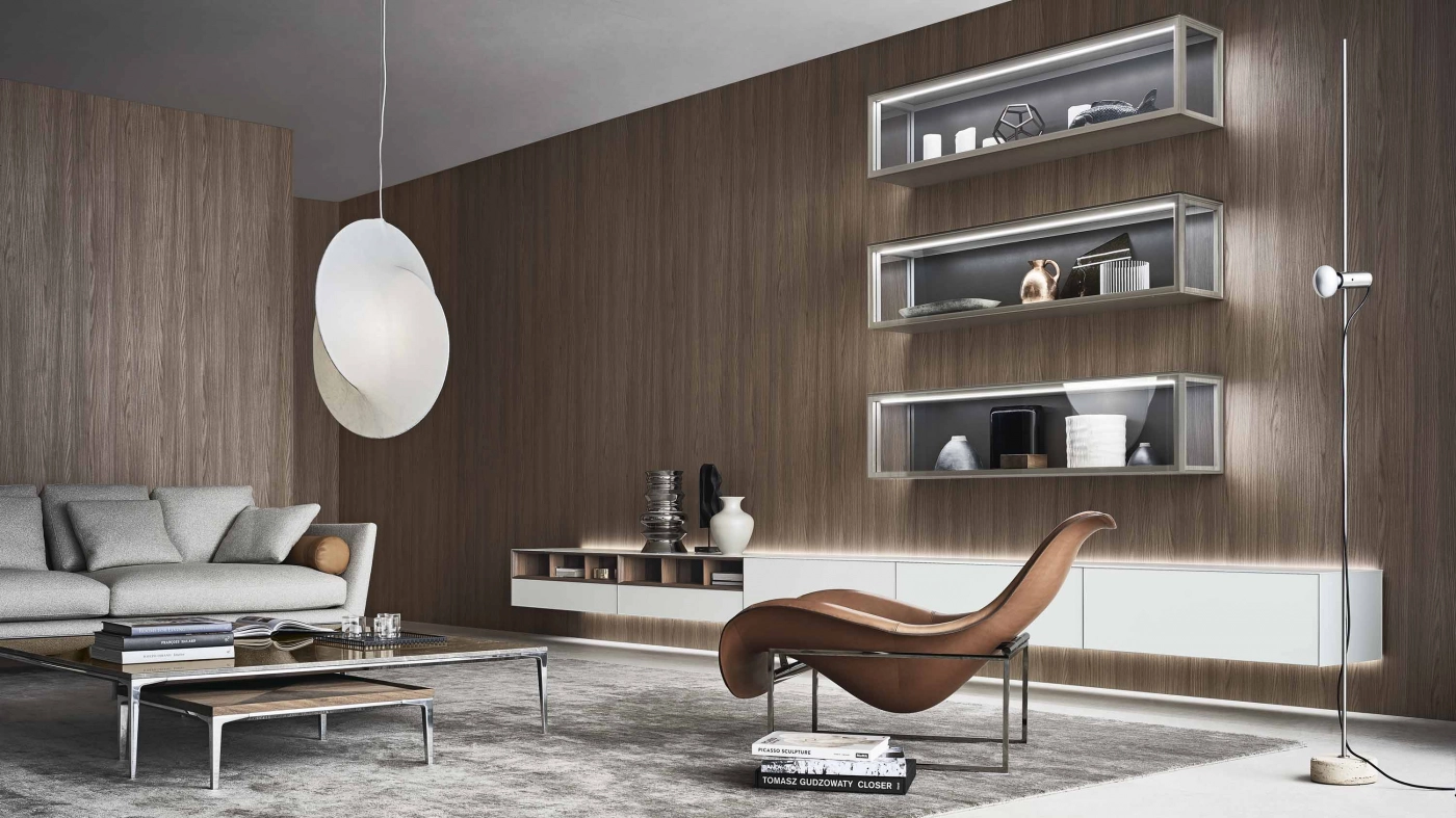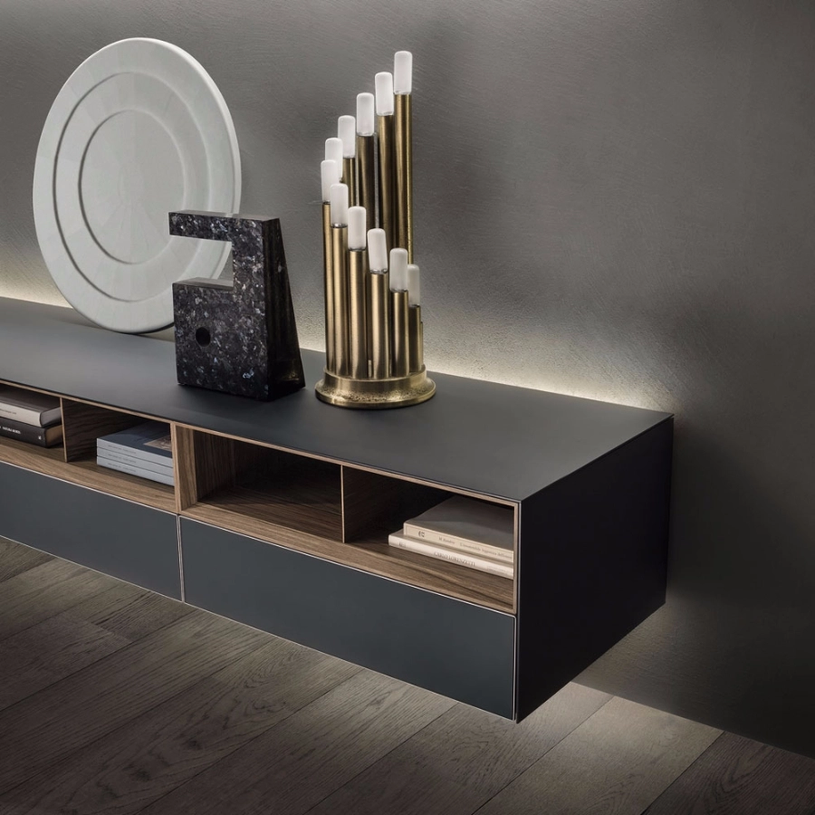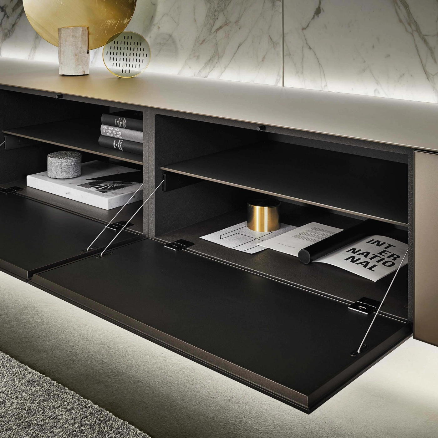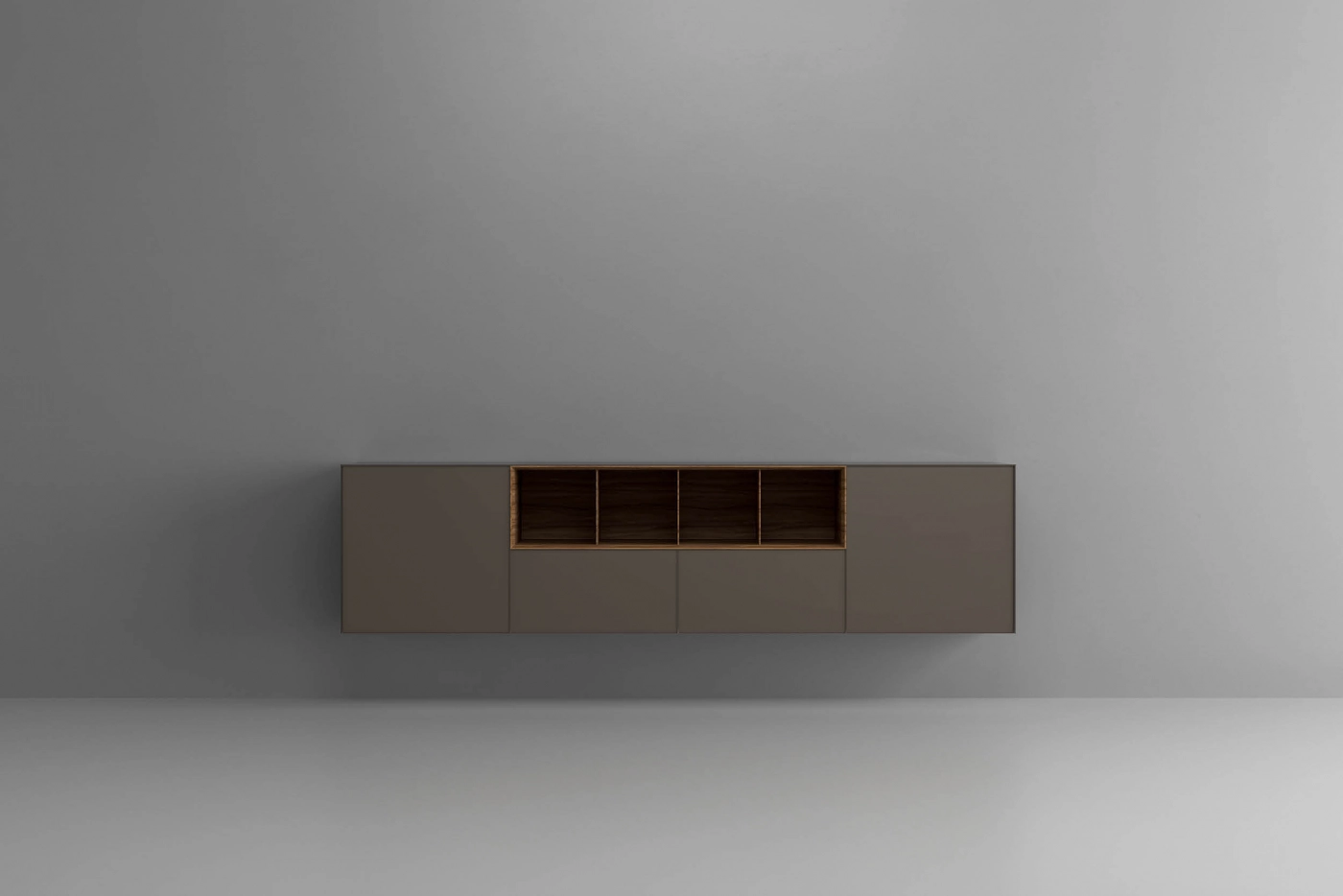 Self a modular system for each area of the house, which allows to create single and double-sided sideboards, tables, drawer units and suspended wall compositions. A project whose main quality is its versatility, combining the aesthetics of Rimadesio lacquered glass in all its variety of Ecolorsystem colours. Self can be freely designed, with modular horizontal compositions or vertical shaped cabinets. The system consists of set of drawers and flap doors, completely covered by lacquered glass, and wooden open modules lacquered in Ecolorsystem finishing.
