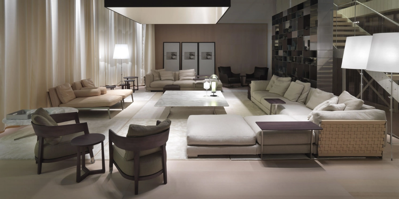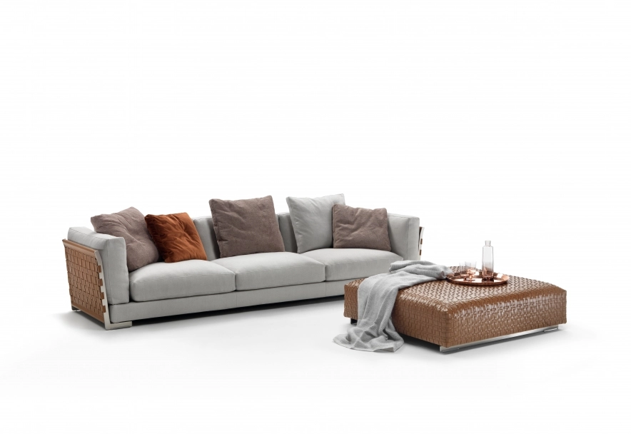 The Cestone sofa was designed to be placed at the center of the living room. In the spotlight are the sofa’s back and sides, parts that cannot usually be counted on to bring added value. Instead, the back and sides of the Cestone sofa are made up of a metal structure upholstered with woven strips of cowhide. Two options of the irregular woven pattern, with strips in two different widths, are available. The cowhide strips can be closely woven, forming a compact surface; or more loosely woven, allowing the underlying upholstery fabric to show through. The resulting ‘checkerboard’ pattern makes a strong visual statement in aesthetically pleasing contrast to the soft, perfectly-proportioned upholstered parts.