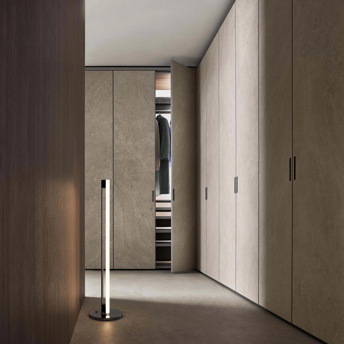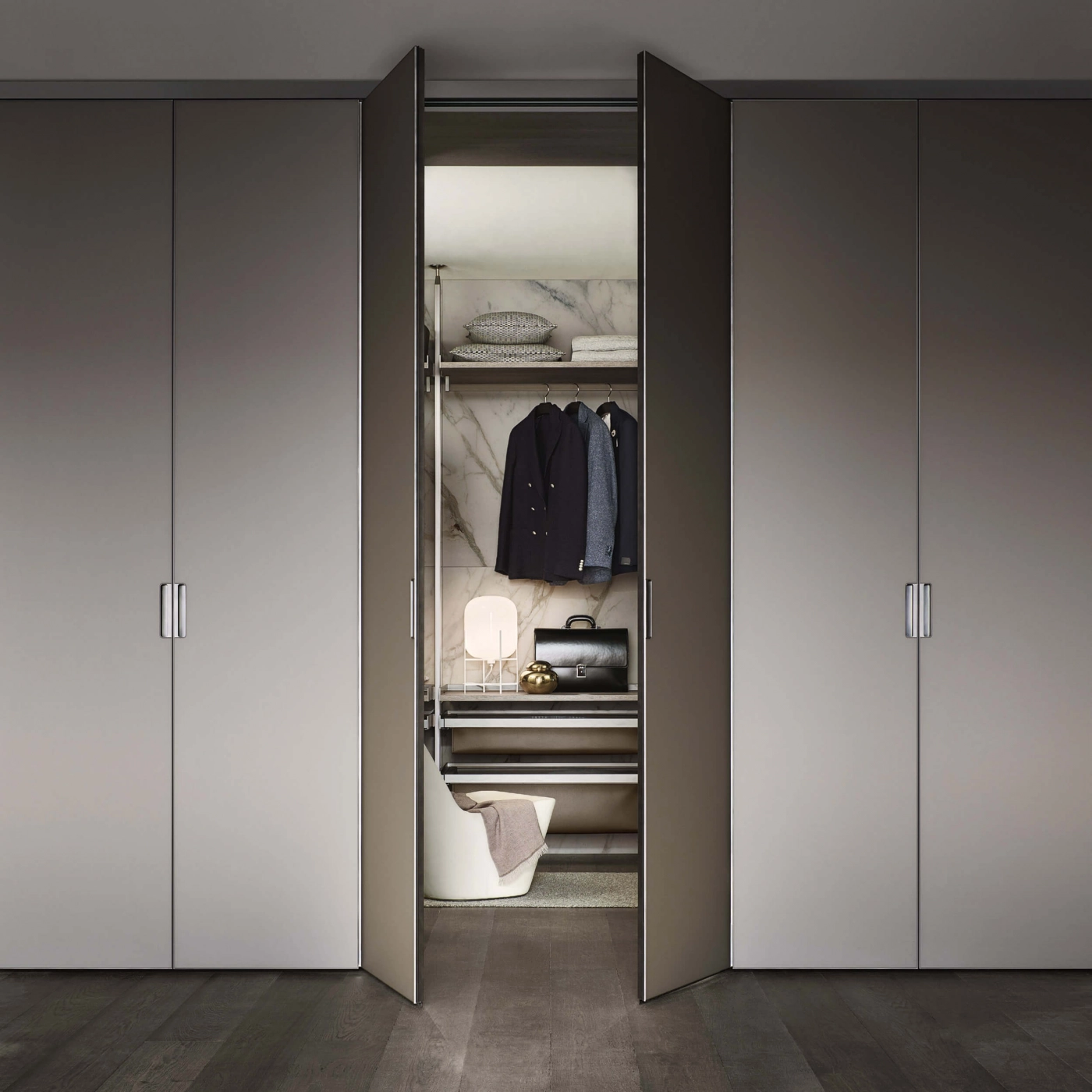 Cover freestanding is the self-supporting version of the Cover system, therefore equipped with side panels and back panels, thus creating linear or corner compositions, always custom made.The perfect finish of the back panels and the inside of the doors make Cover freestanding an ideal system also for niche solutions, complete with integrated through way. The internal equipments are fixed directly to the uprights, without visible screws, which allows a free and easily adjustment over the time.