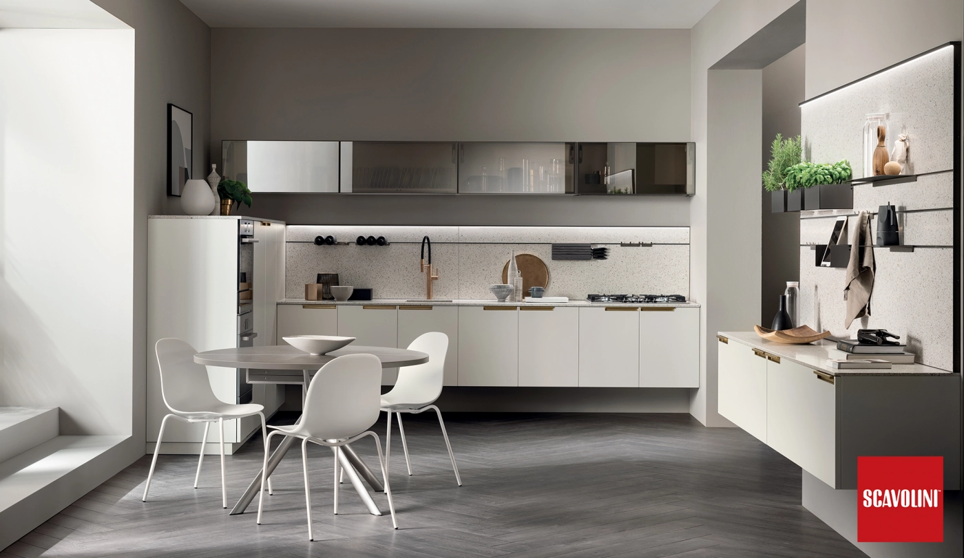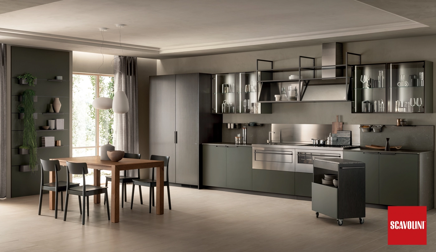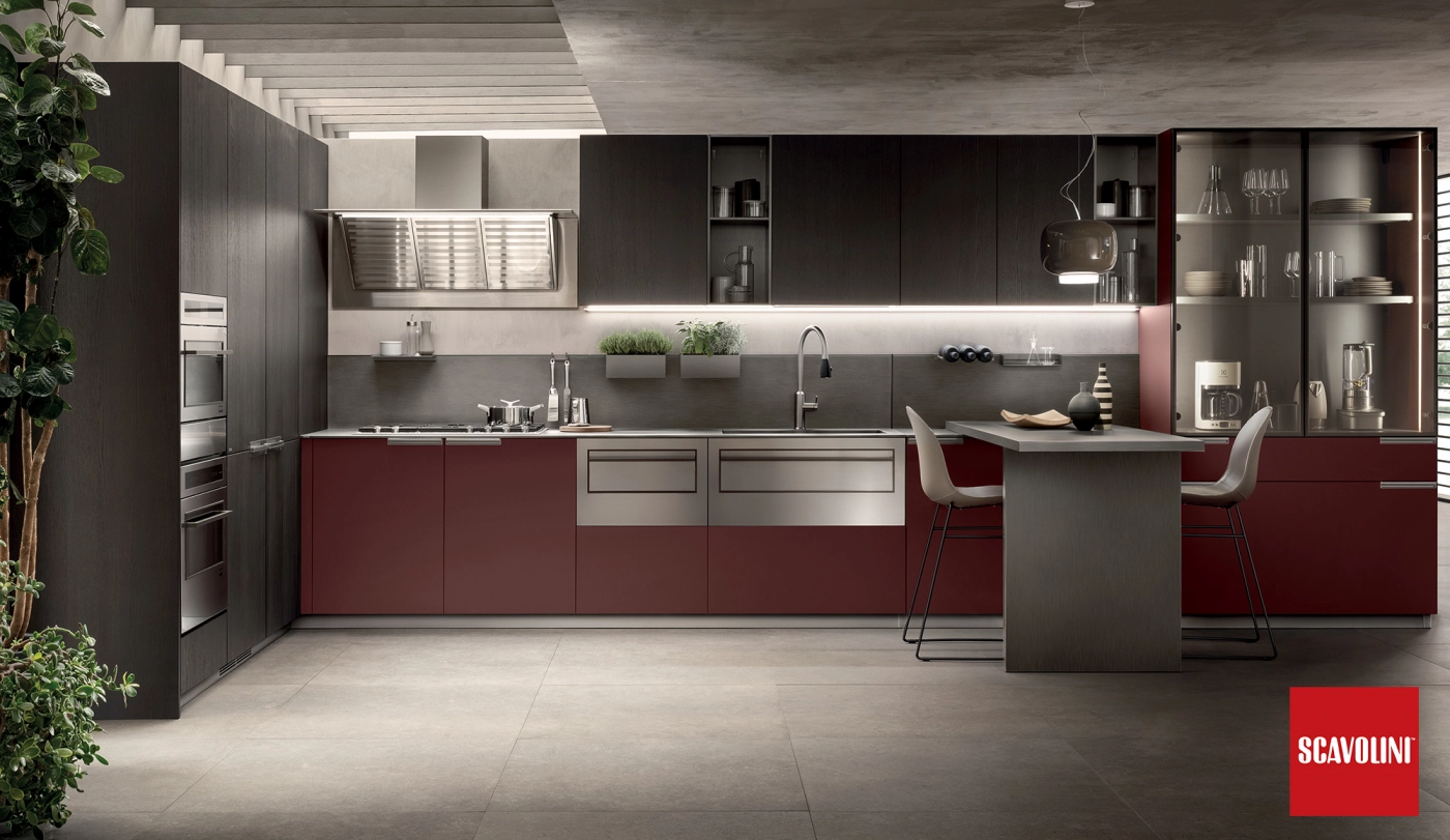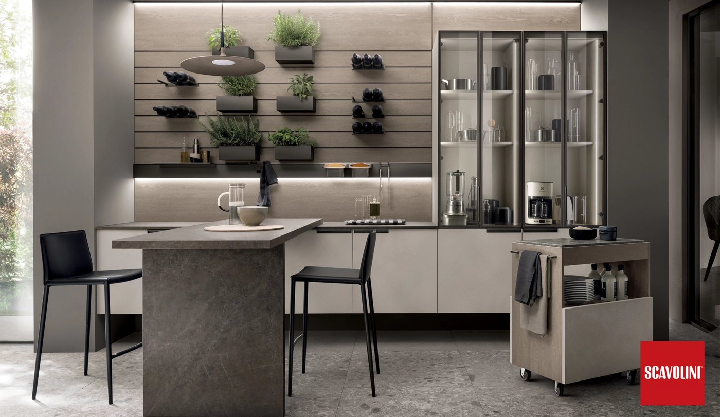 From a two-year collaboration between Scavolini and a renowned Michelin-starred chef comes MIA, a unique project which brings the features of a “great kitchen” to your home.The keyword is professionalism.Many “ingredients” come together to create this “tasty”, comfortable, custom-sized kitchen space in which to up your cooking game: an exclusive handle design, new finishes to choose from (Pinstripe Oak decorative melamine, Dark Steel, Stopsol glass and Clay Biomalta), and a stunning Line System affording functional and sophisticated customisations. But, above all, new element modularity, to amplify the capacity of base units and wall units. Even the appliances supplied (including a vacuum drawer with new marinating function and a food-warming lamp) enhance the desire and love of cooking hidden in each one of us: technology that brings a touch of “refinement” even to everyday meals.