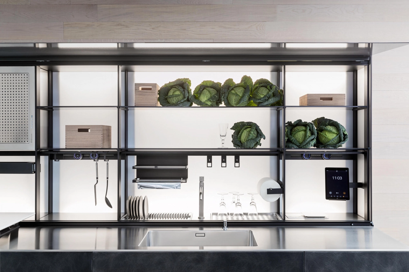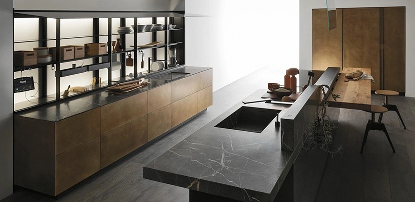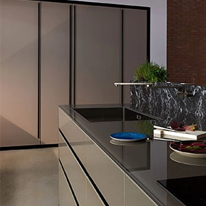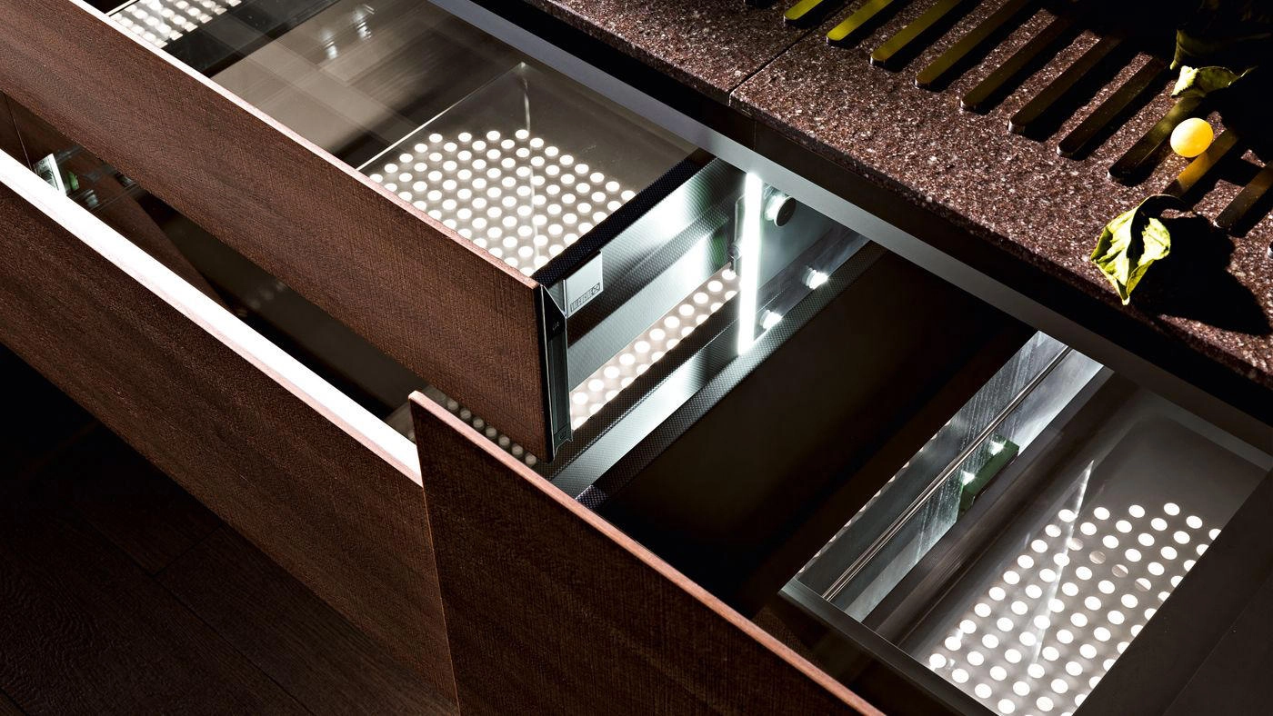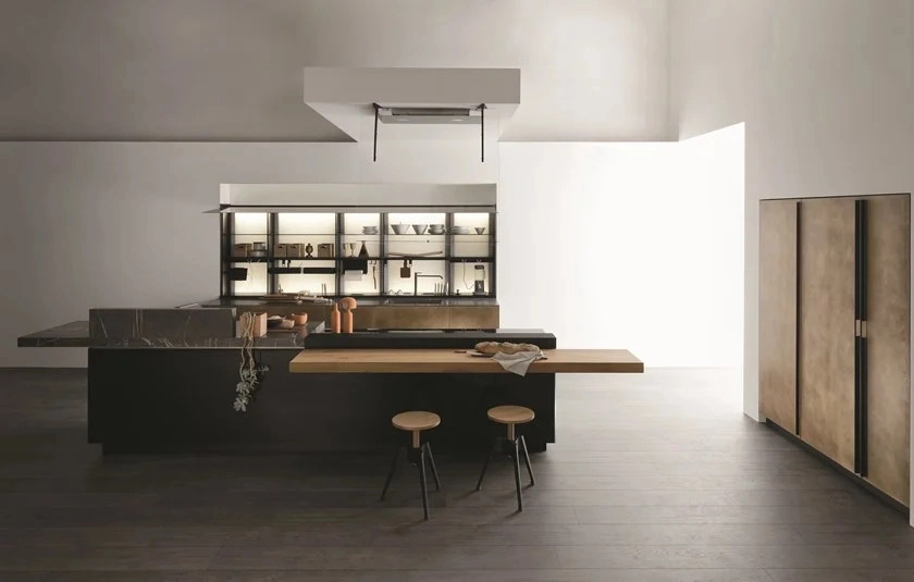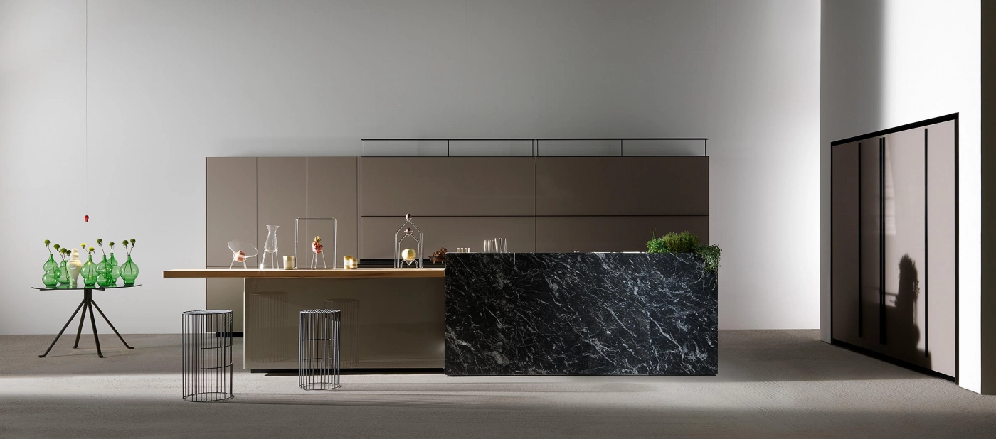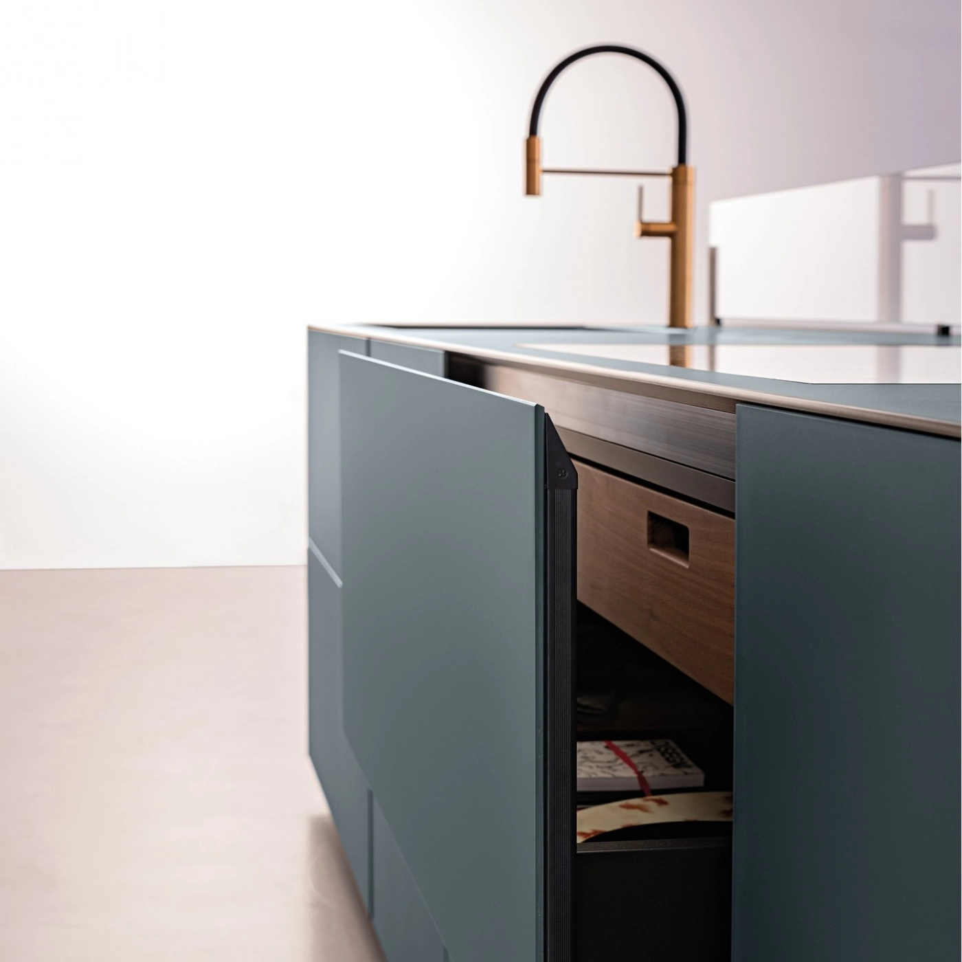Our intuition led us to using “pure” (not bonded) materials on the aluminium structure of the Artematica kitchen doors, a move which opened up endless ideas and combinations. From the refined use of glass in every colour and finish to wood that conveys strong tactile sensations to lacquered surfaces and metal laminates, Artematica kitchen has been designed down to the last detail to make movements more fluid and more assured, to bring about a softer closure of cabinet doors and to respect the highest safety standards thanks to rounded corners and edges.