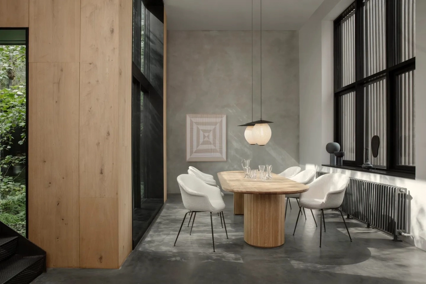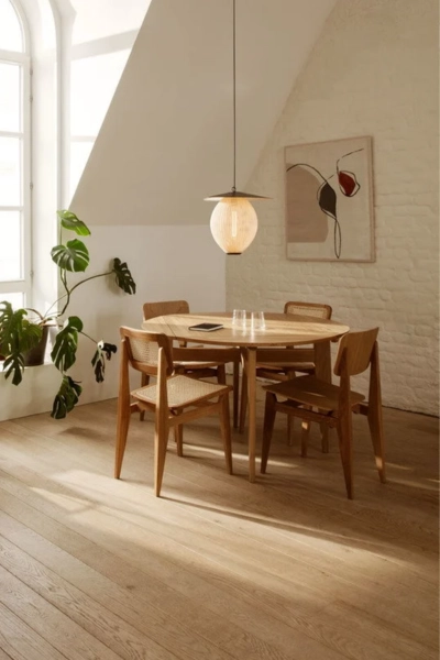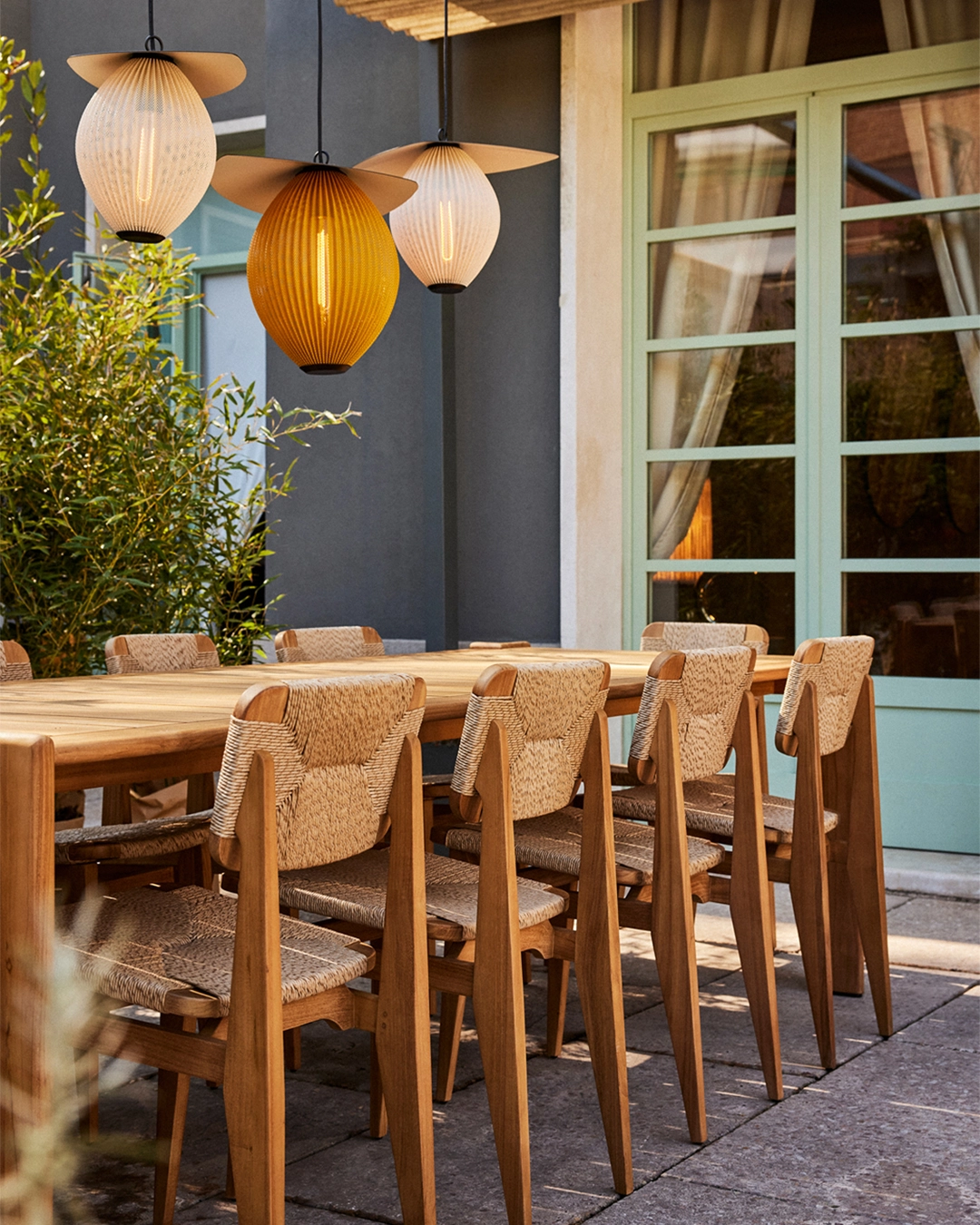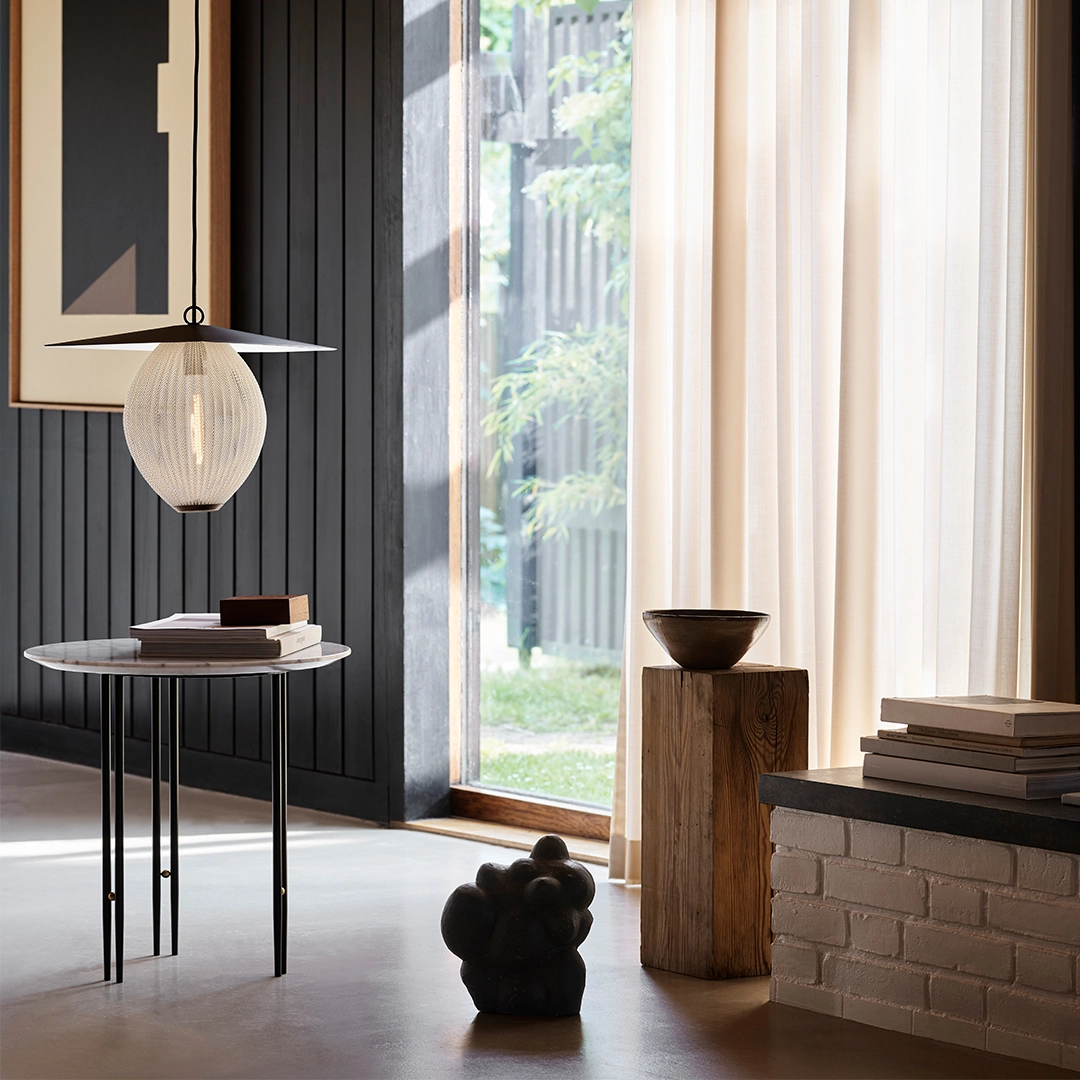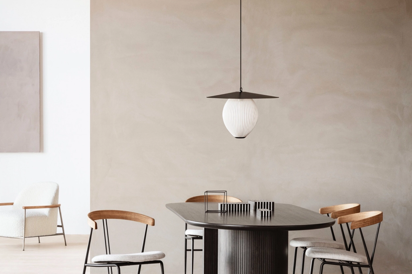 The Satellite Pendant of two sizes is designed by Mathieu Matégot in 1953 with geometrical shapes and an organic shade to create outstanding sculptural aesthetics. The name, Satellite, was given by Matégot as a wink and tribute to the scientific progress in France in the years after the Second World War. The Satellite Pendant holds the distinctive trait of Rigitulle, a technique and material invented by the designer himself that makes it possible to bend and fold the fabric-like metal sheet to an original, oblong-shaped pendant lamp. The lampshade has five colour options; midnight black, white cloud, shy cherry, venetian gold and rainy grey, and is unique with its bulb all covered by perforated metal to exude an atmospheric light - creating a festive appearance.