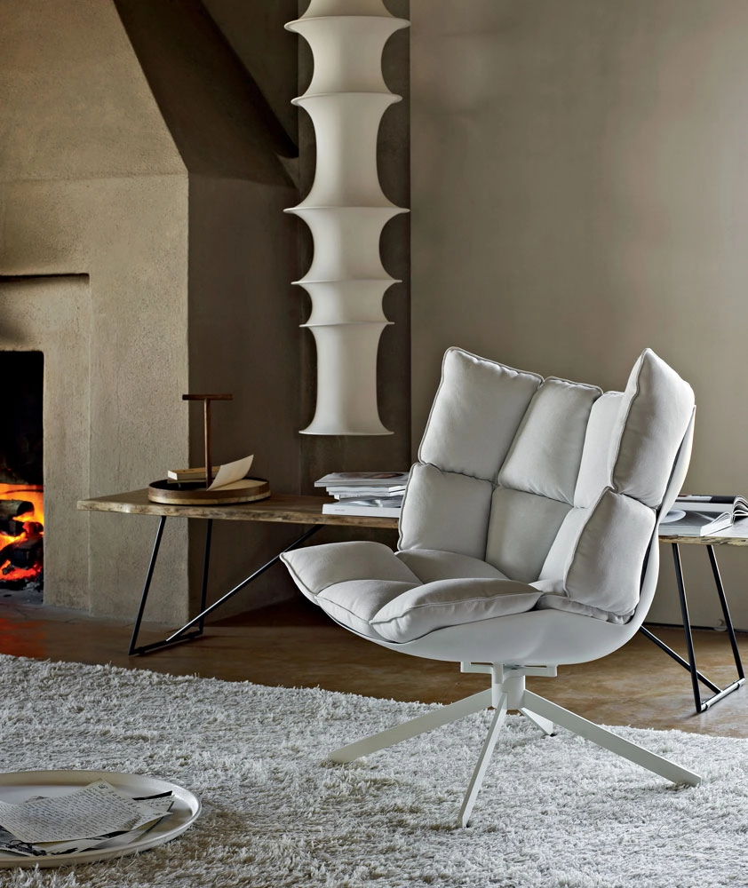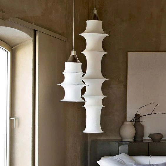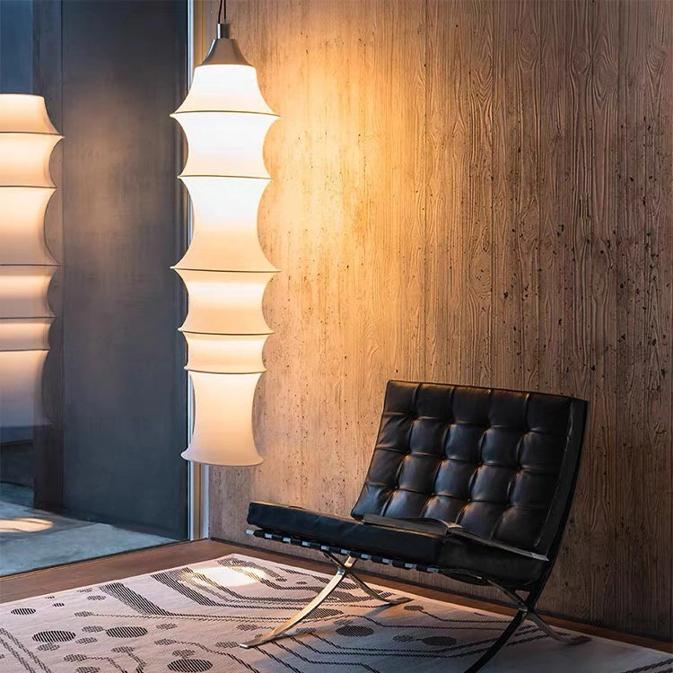 Falkland suspension is a lamp with a spontaneous shape that is achieved by the contrasting forces of its components: the tension of a stretched tube of finely woven fabric and the weight of seven different sized metal rings. A single light bulb and aluminium reflector illuminate the curves of the fabric.