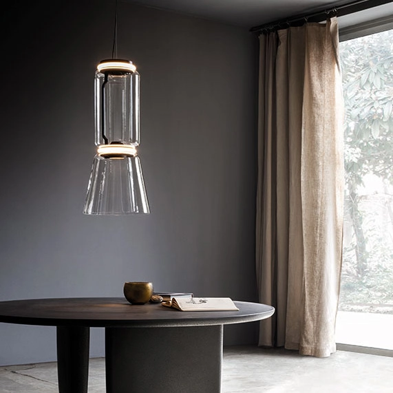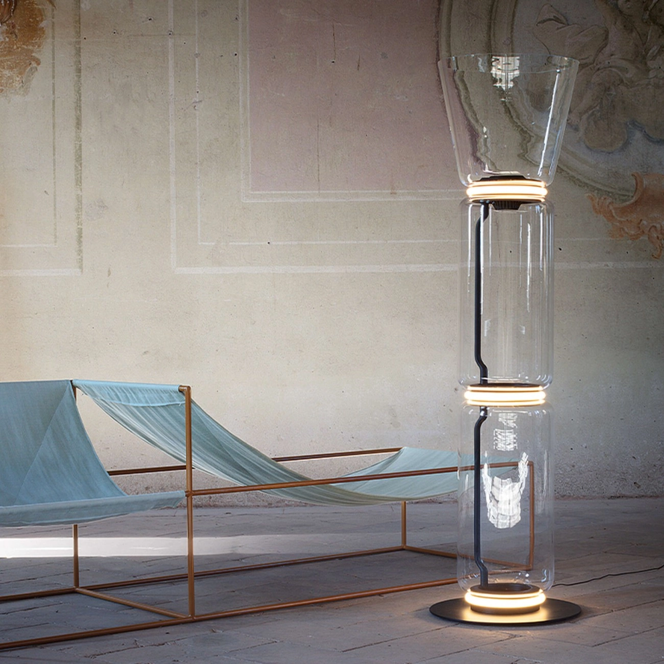 Noctambule: the night owl or reveller. Mostly invisible during the day, but coming to glamorous activity at night-time. The analogy is fitting. The new collection of lamps is made of blown glass modules, which are see-through and therefore almost inexistent at day-time. But, when you switch them on in the dark, they transform into georgeous, illuminated lamps. The cylindrical glass modules set the basic grammar of the collection. The single module is a lantern. Several modules stacked on top of each other create a light column, or suspended chandelier inside a stair well. Extra elements such a glass dome or cone shaped head allow for added performance such as a floorstanding uplighter and pendant. The carefully calibrated LED technology which powers the lamps is discretely integrated into the junctions between the glass modules. Almost absent, but ready to be activated at any (night) time.