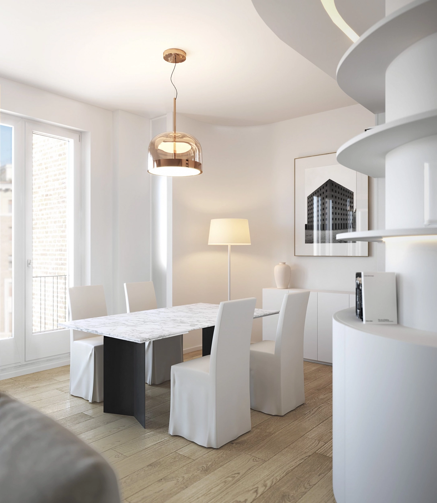 Equatore is a contemporary reinterpretation of the classic lamp with a glass shade. While the traditional abat-jour uses the shade to contain the light source within, in this family of lamps the shade is paradoxically and suggestively empty, with the light being generated by two luminous discs placed inside a central metal band, visible on the shade, that evokes the line of the equator. The light produced by the Leds, thanks to internal screens arranged in layers, is distributed regularly across the surface of the discs, magically illuminating them. The bottom disc directs the light output downward, the upper one illuminates the glass cap for a soft, diffused light. Available in table, floor and ceiling models, in two sizes and two colors: a cooler version in gray with a dark chrome frame, and a warmer version with a transparent dove gray cap and a copper-colored frame.