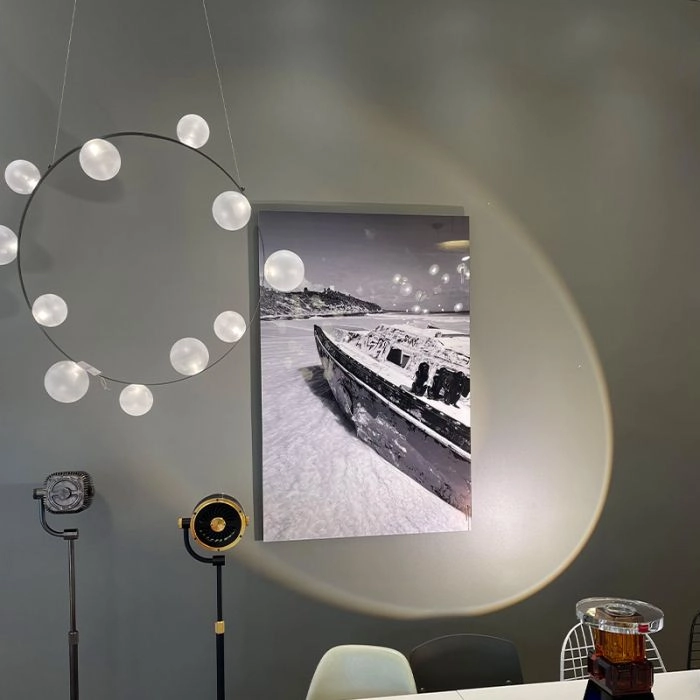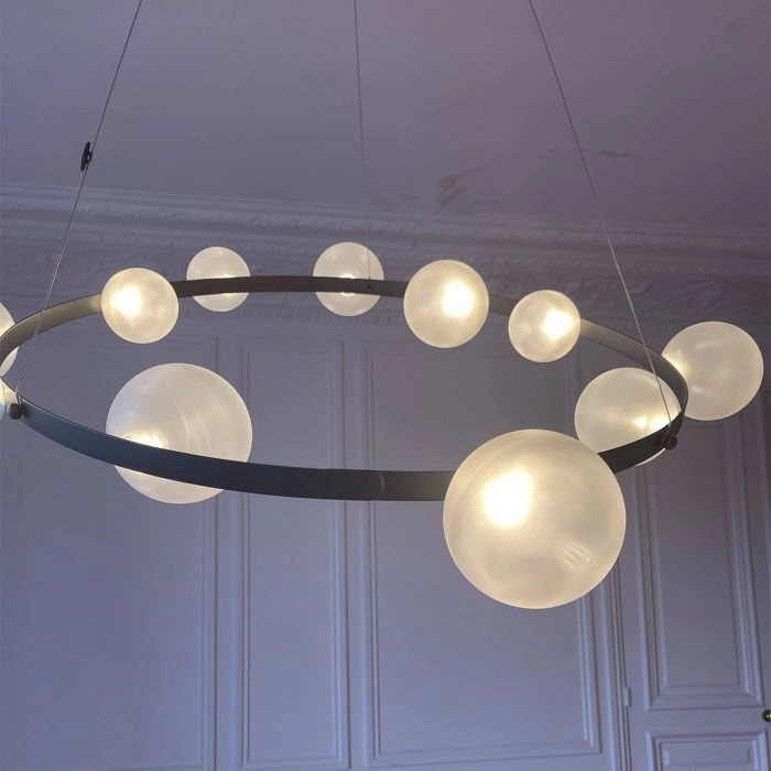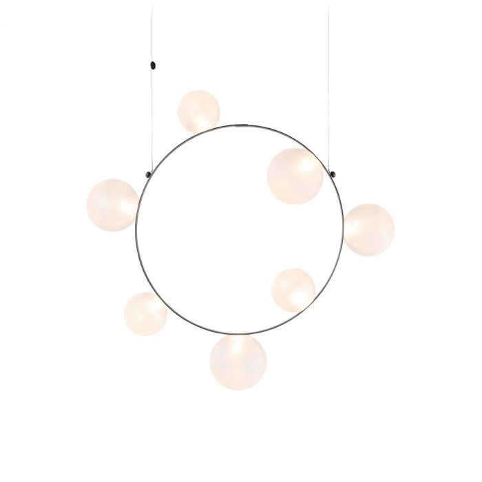 Hubble Bubble, designed by Marcel Wanders studio, is an airy and joyful suspension lamp. Available in two sizes, with either 7 or 11 glass LED bubbles in oil-iridescent or frosted versions. Hubble Bubble can be hung both horizontally and vertically and is powered through Electrosandwich® by Marcel Wanders. Hubble Bubble is the cheery statement piece in your home that can hang from any angle.