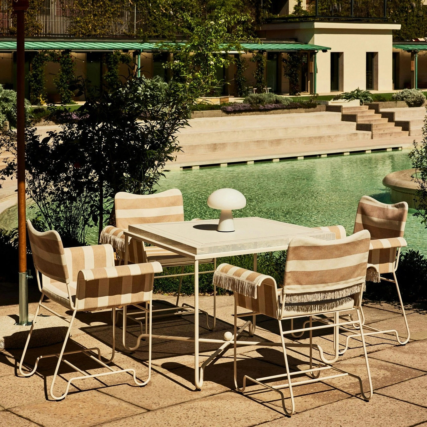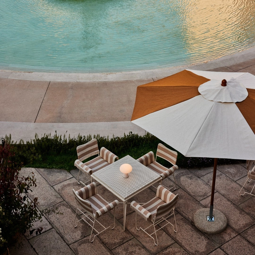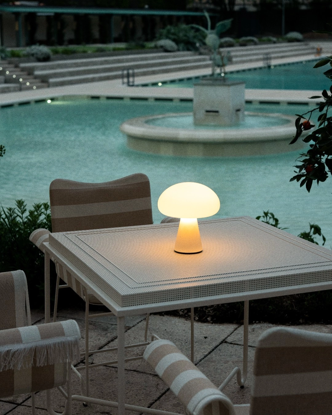 Let the Obello Lamp light up your interior or pick it up and carry it outside to create the sense of an ‘outdoor room.’ The shade is made from mouth-blown glass – a challenge given its shape – as a nod to old petroleum lanterns, and the portable size makes it easy to carry. This materiality and craftsmanship add value and tactility, making each lamp unique. The Obello Lamp is an iconic space-age design that will make a strong statement, either as a playful centerpiece or a point of curiosity within any outdoor space.