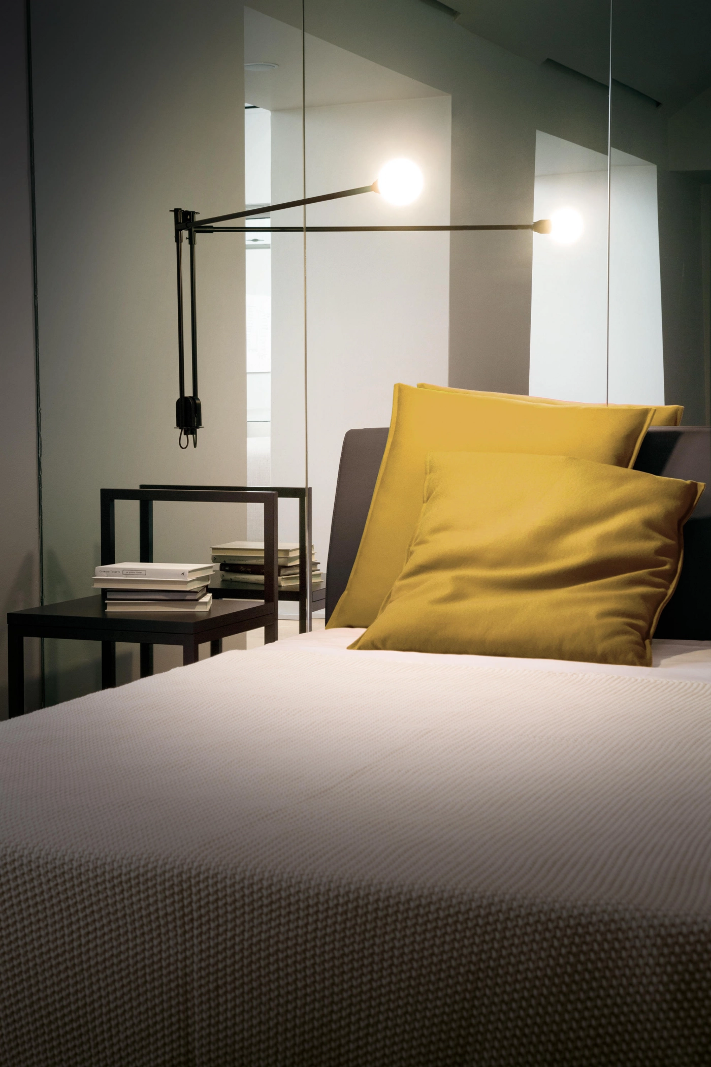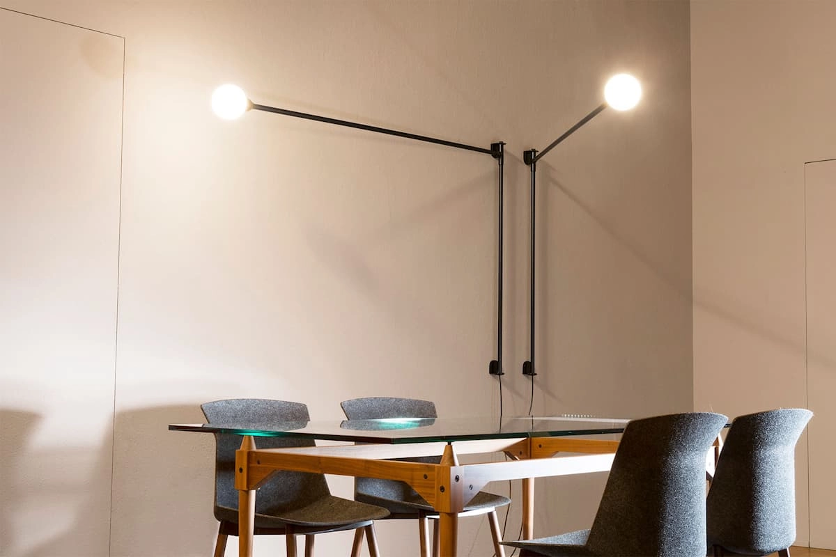 Charlotte Perriand was inspired by the boom of sailboats when in 1938 she conceived Potence Pivotante. Designed as a highly accessible swivel lamp, realized using two black tubular sections assembled in the shape of an inverted ‘L’ to lead the electrical wire from the switch to the bulb. The steel arm fixed to the wall rotates on the horizontal axis, describing an angle of almost 180°.