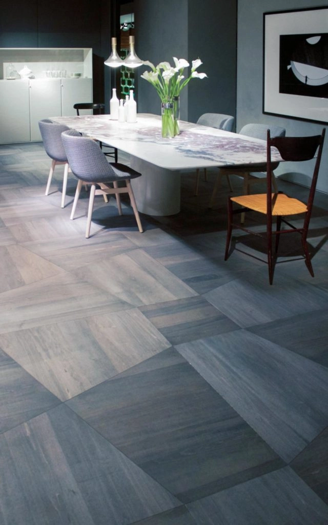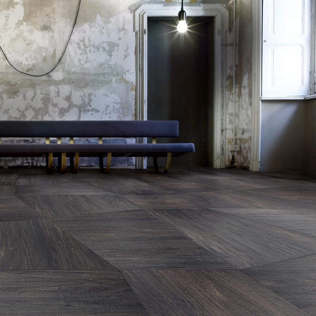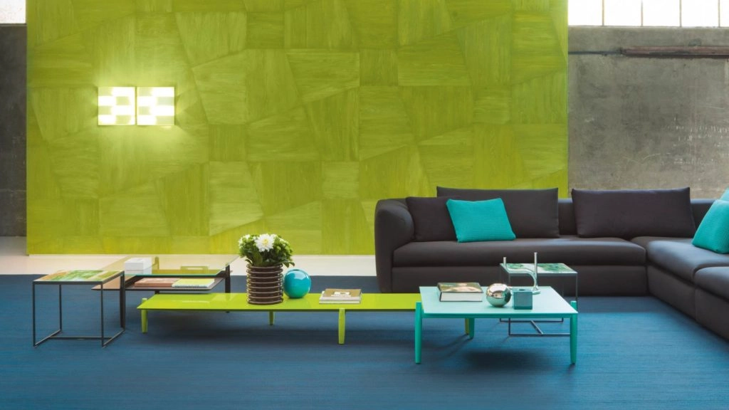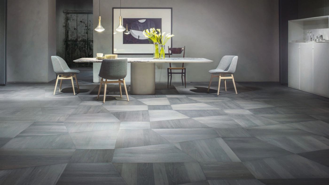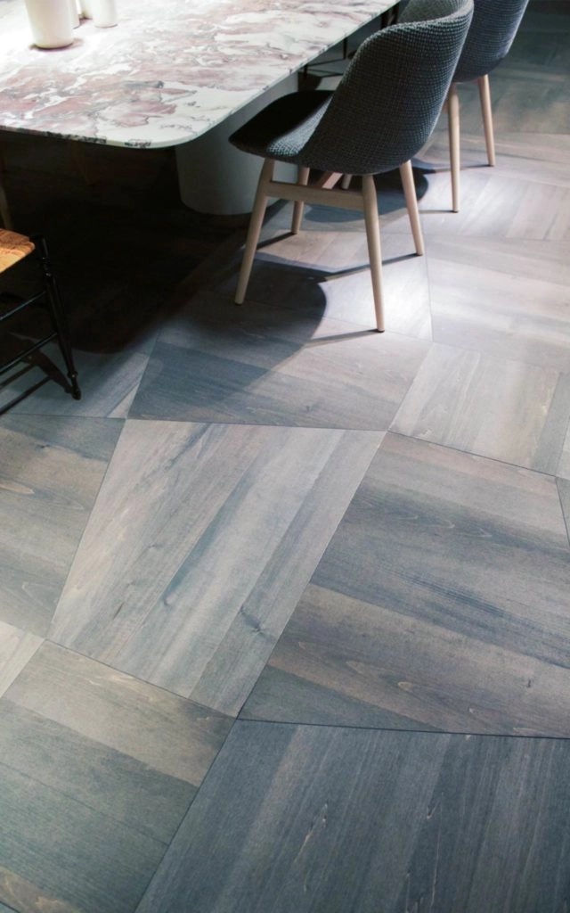 The project, which is inspired by the geometric representation of the Pythagorean theorem, is the result of an intense partnership between Listone Giordano and Paola Lenti.The geometrical modules may even be installed on the wall to turn into unusual wainscoting and dyed in surprisingly bright colours – Acqua, Olio, Ottano and Grafite – that leave the natural veining of the material visible.