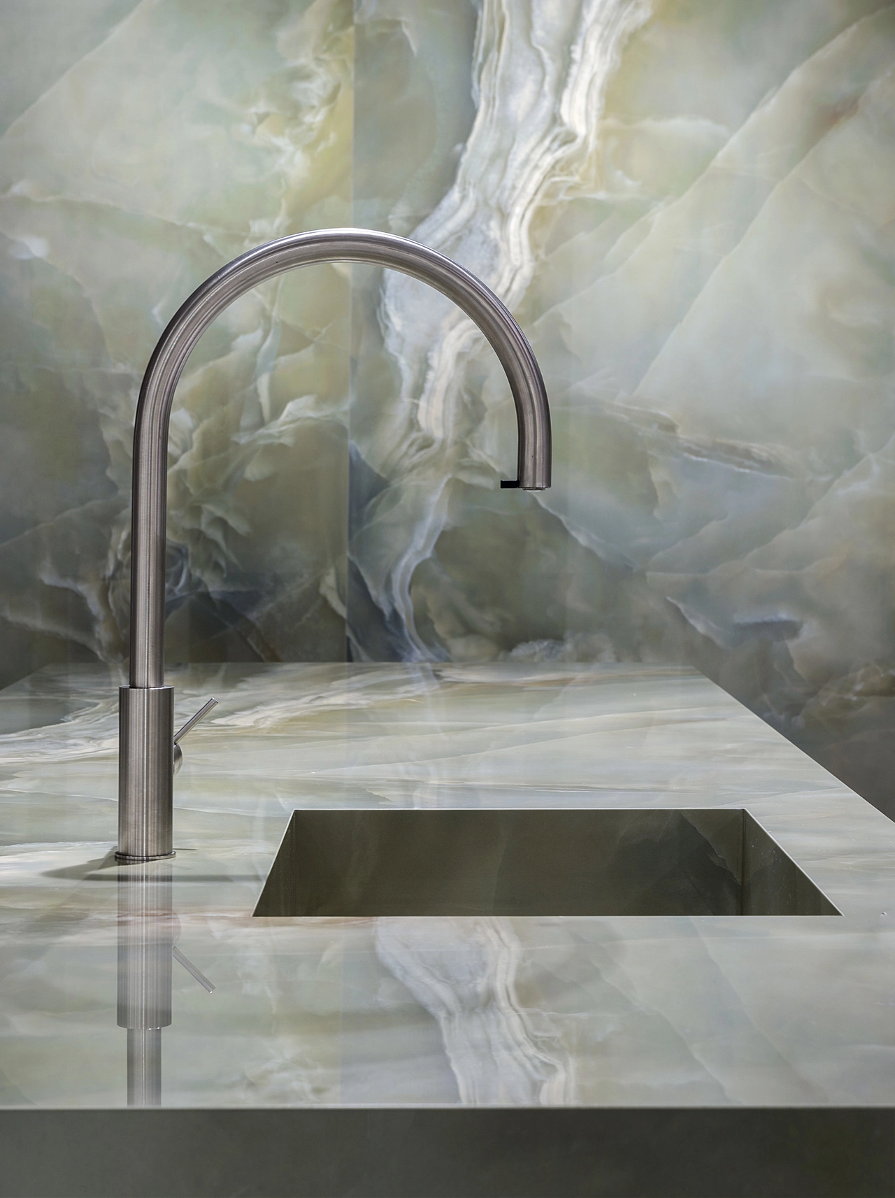 The exceptionality of its luxury combines with the light weight of the large size in the minimum thickness to conquer an excellence in flooring and coverings of surfaces both large and small. The technical performance of the materials comes to the fore in the harmony of the onyx and encroaches into the design guaranteeing a uniformity and flexibility of planning, even when applied to objects and furnishing accessories.