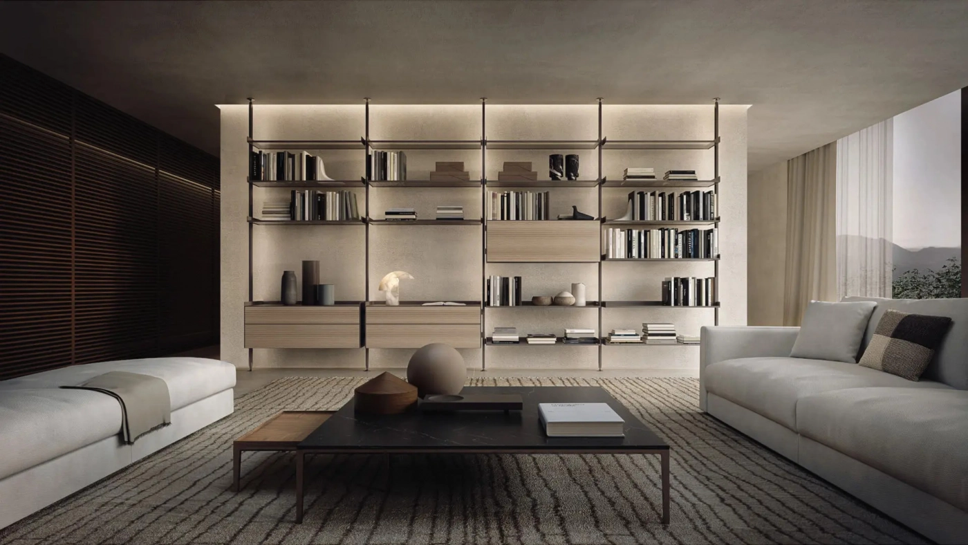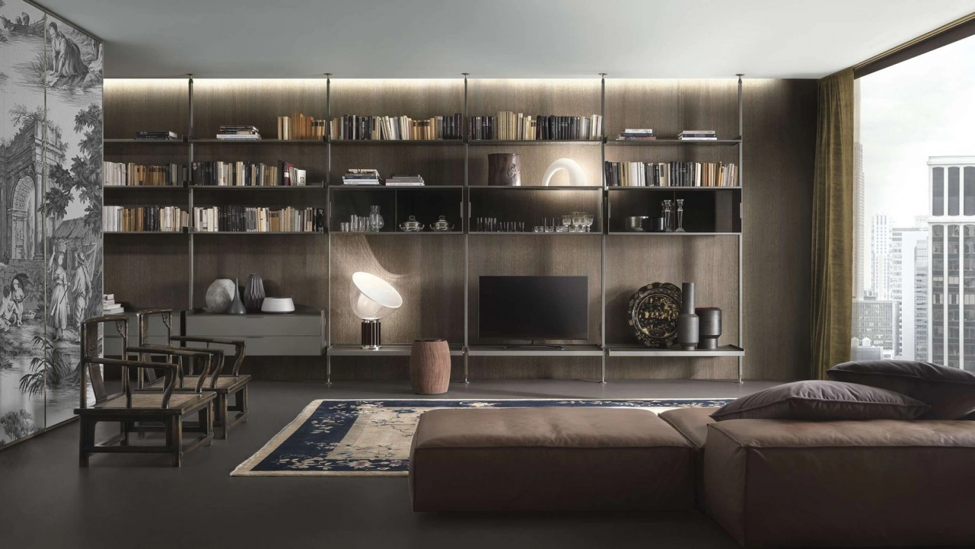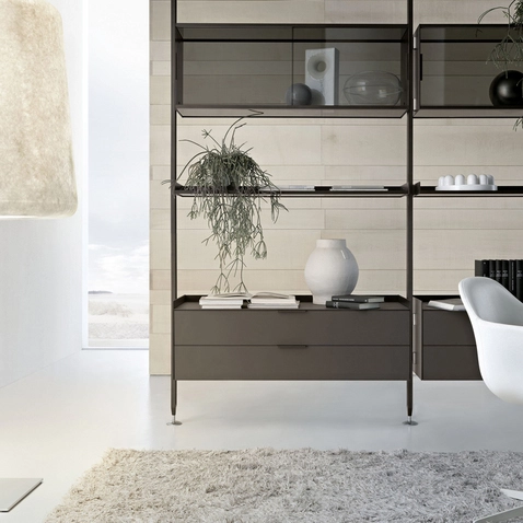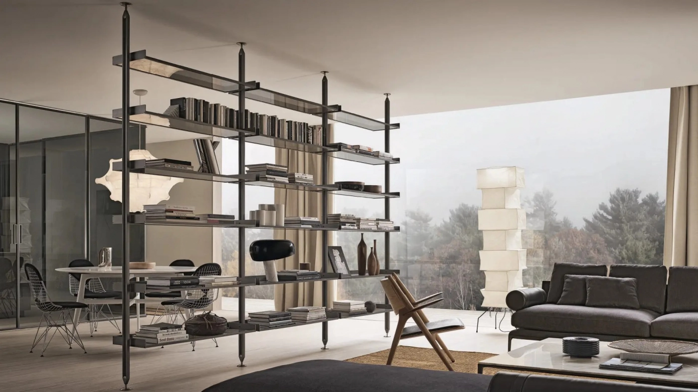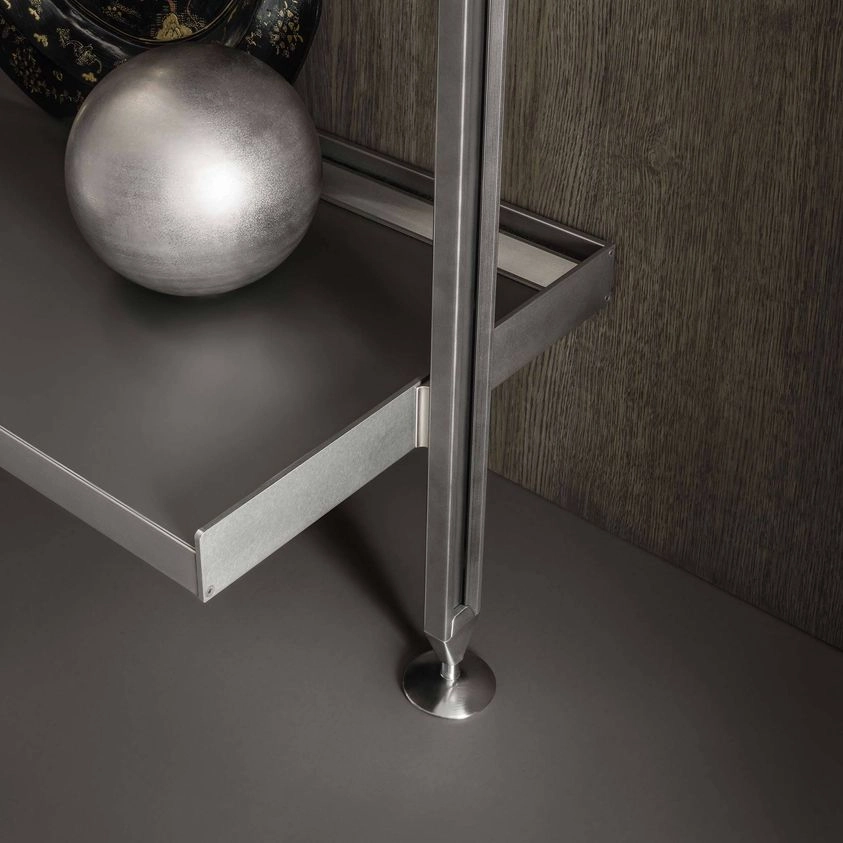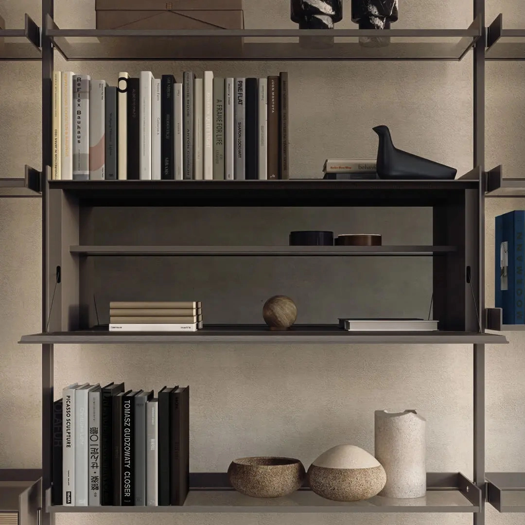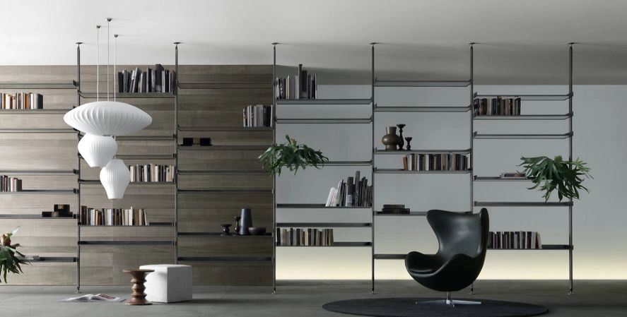 The iconic bookcase of the Rimadesio collection in the pursuit of lightness and project versatility. The uprights, fixed from floor to ceiling and always custom-made, allow a free positioning of the elements, in the desired number and at the desired height.The exclusive hooking system element guarantees the maximum structural solidity and allows to level every element.