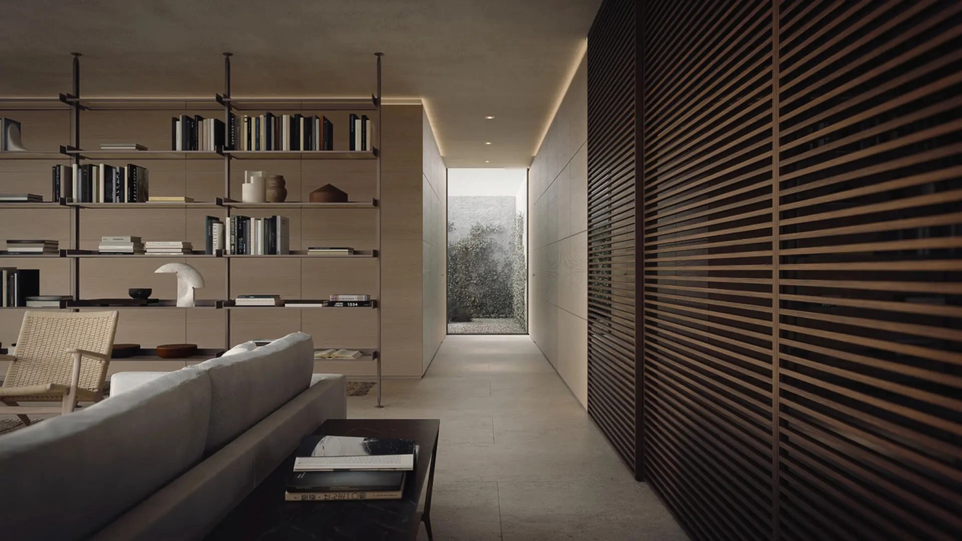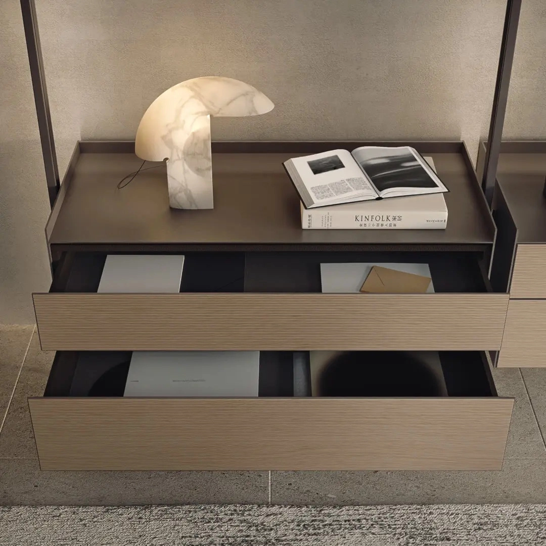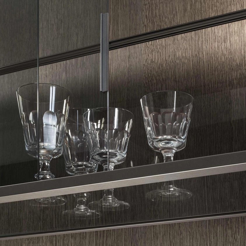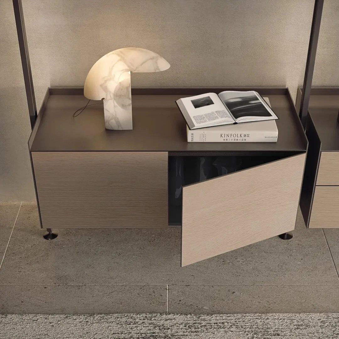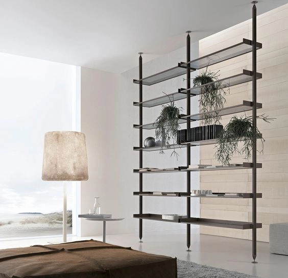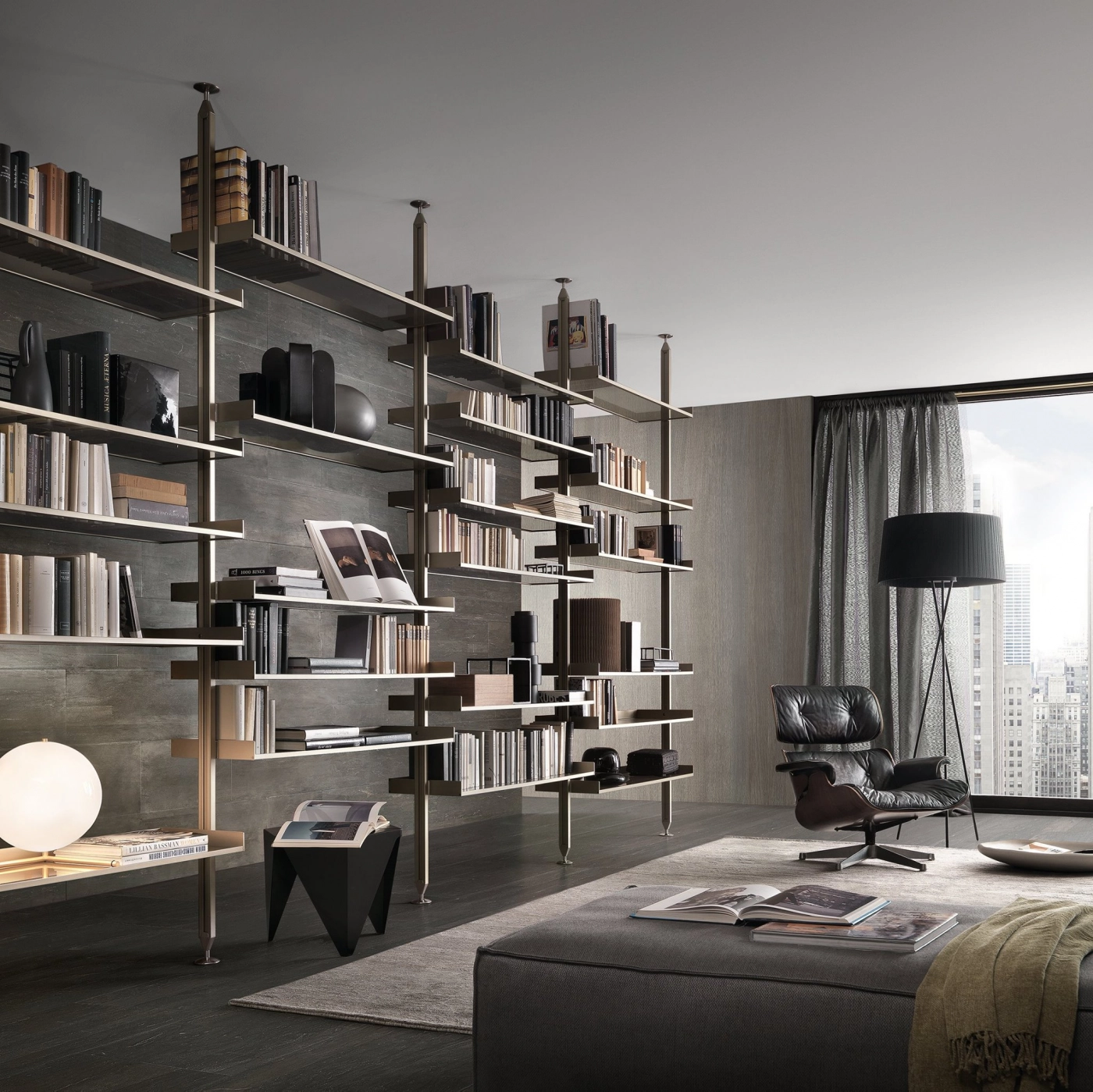 The iconic bookcase of the Rimadesio collection in the pursuit of lightness and project versatility. The uprights, fixed from floor to ceiling and always custom-made, allow a free positioning of the elements, in the desired number and at the desired height.The exclusive hooking system element guarantees the maximum structural solidity and allows to level every element.