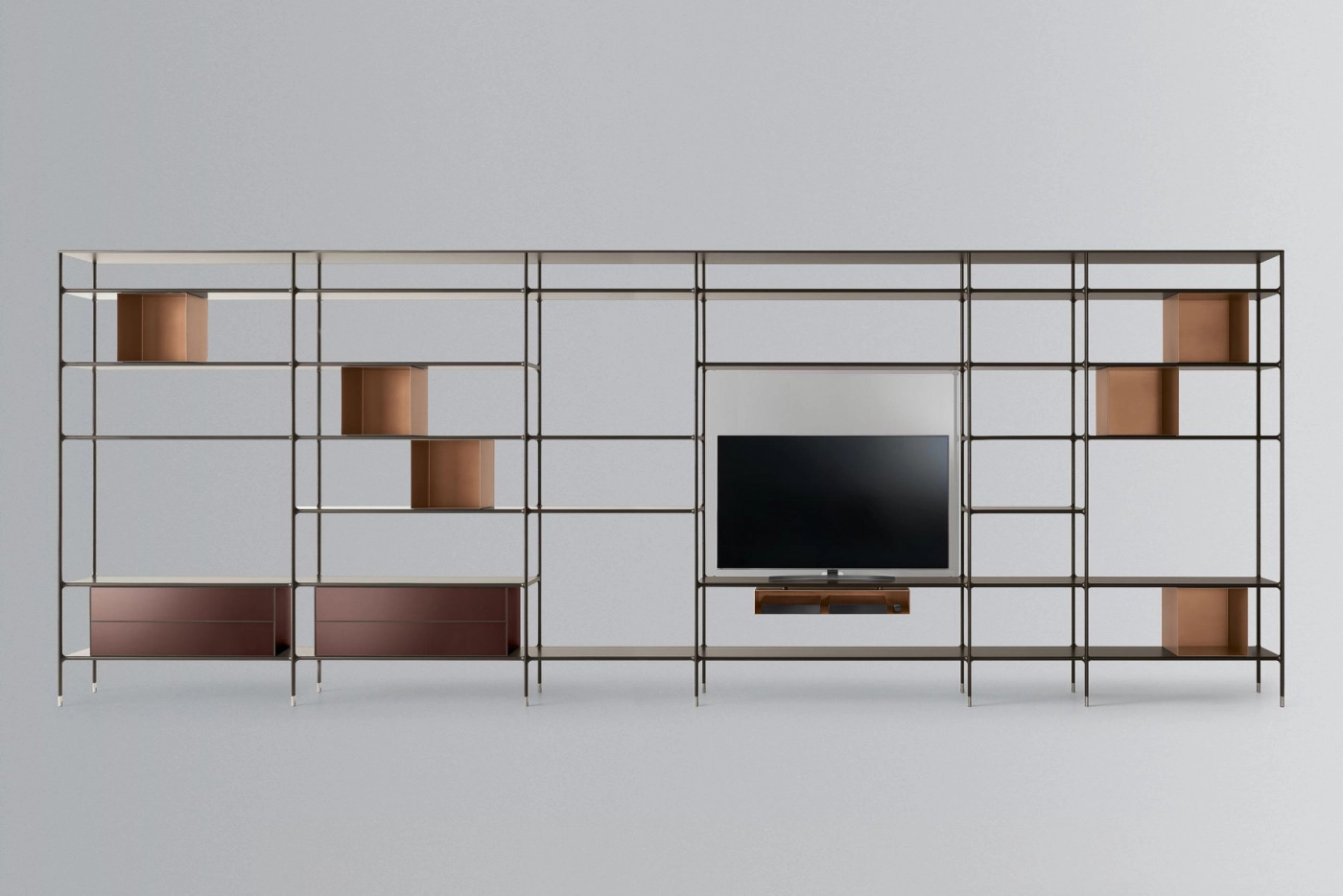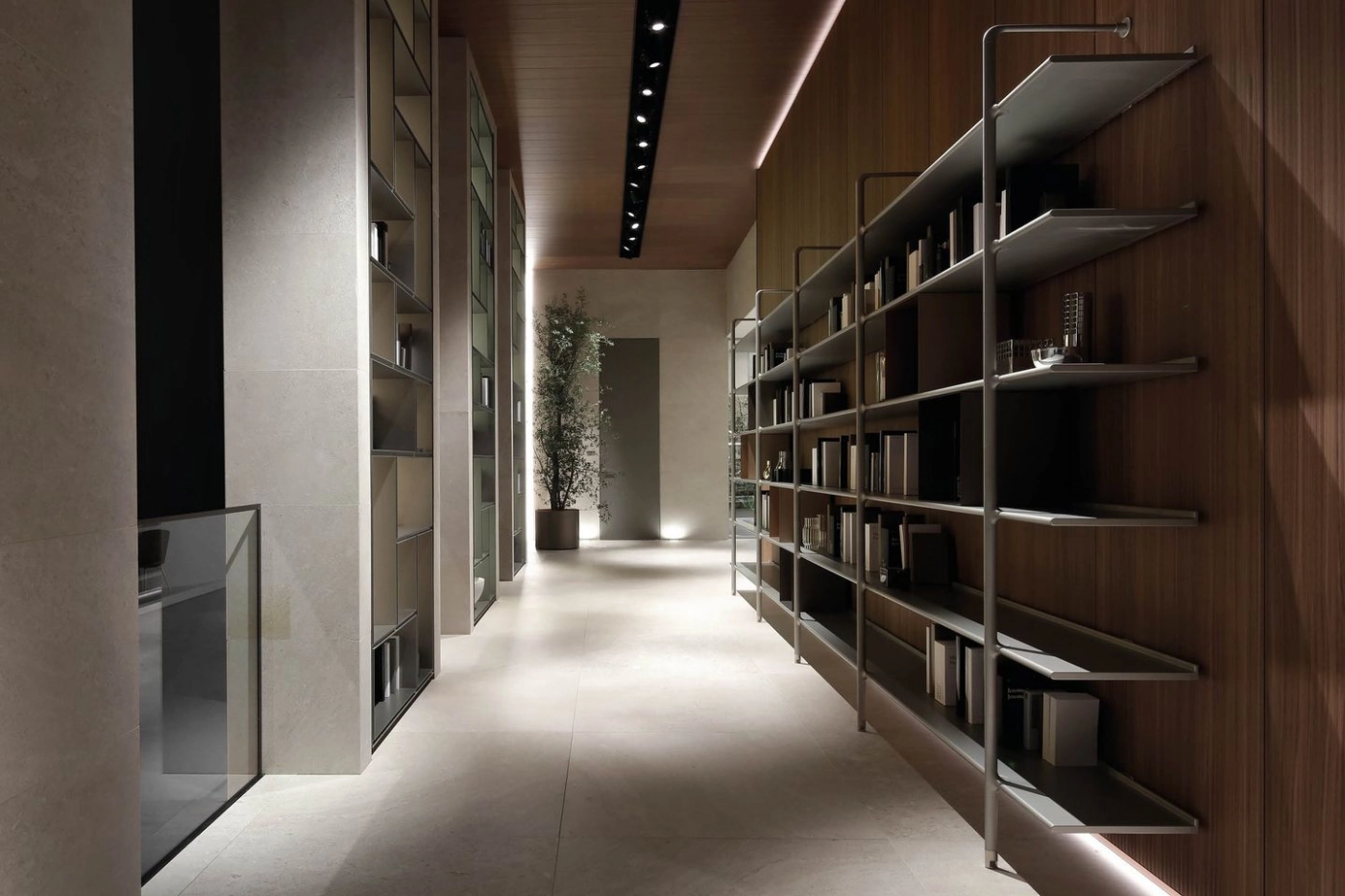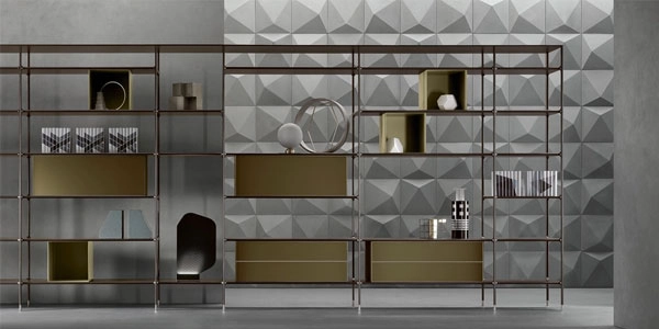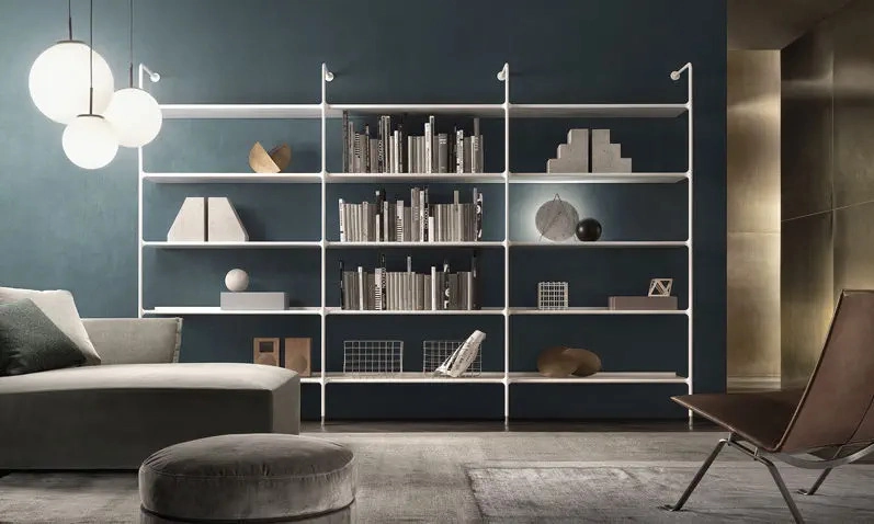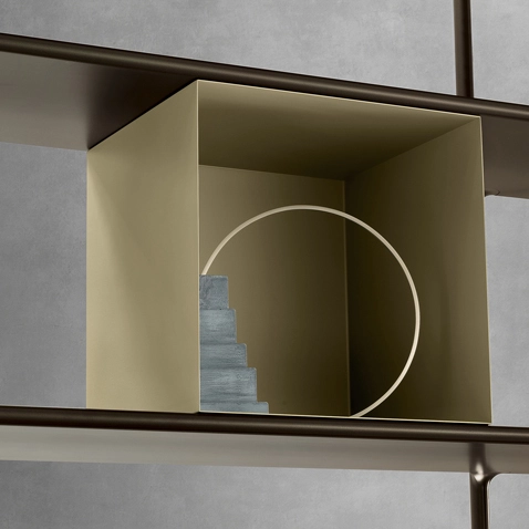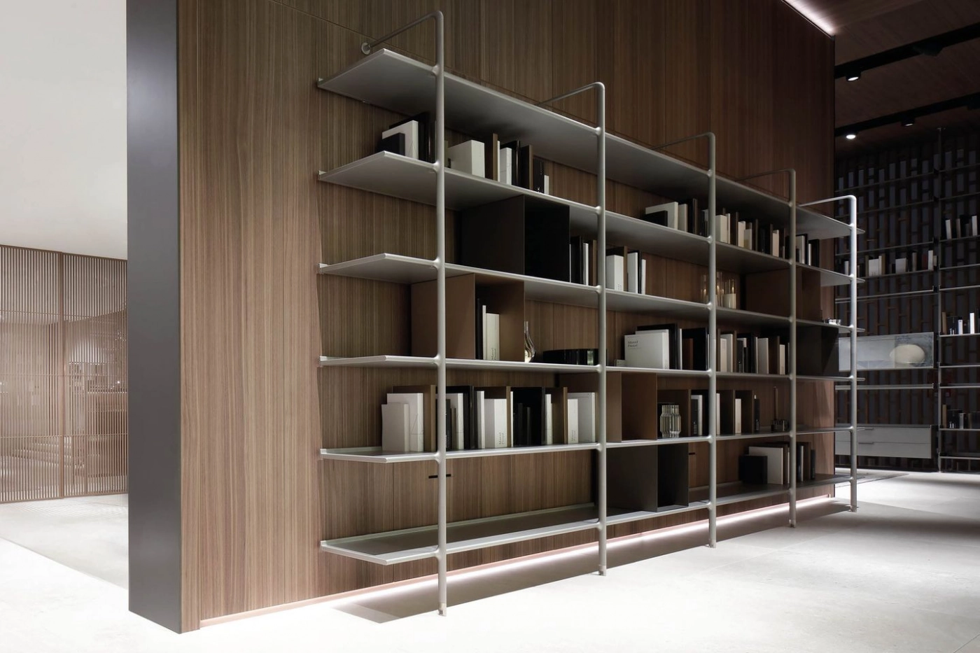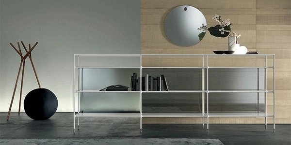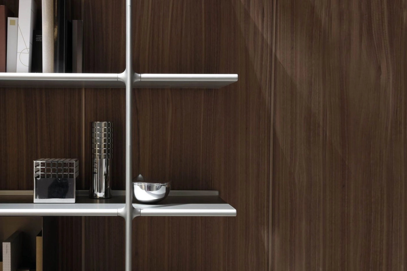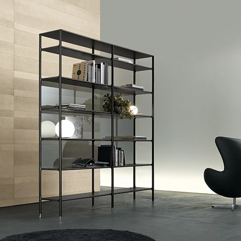 Is the archetype of the bookcase in the new interpretation by Rimadesio: a modular system combining aesthetic lightness and technological innovation.The focus of the project, entirely in aluminium, is represented by the union between extruded shelves and die casting uprights, in central and terminal versions. Vertical modularity of Wind is obtained by the connection of nylon fibre joints inserted into the uprights which grant the maximum stability. Closing element of each composition is the laminated lacquered mdf top, covered by a double aluminium plate.