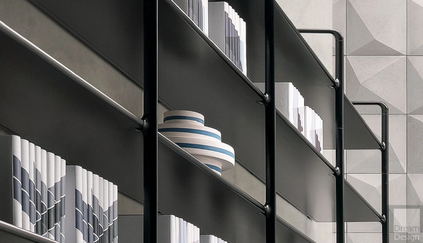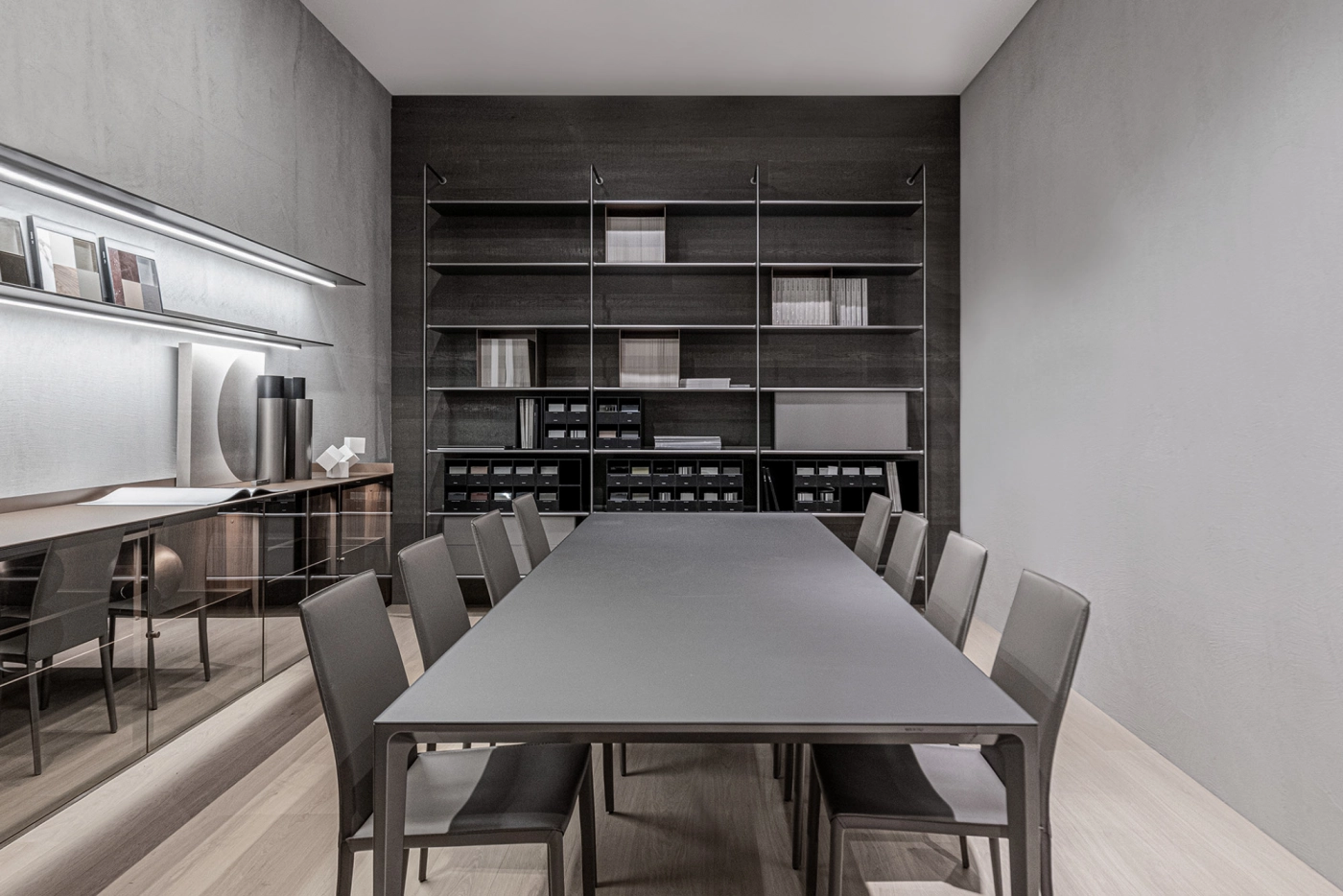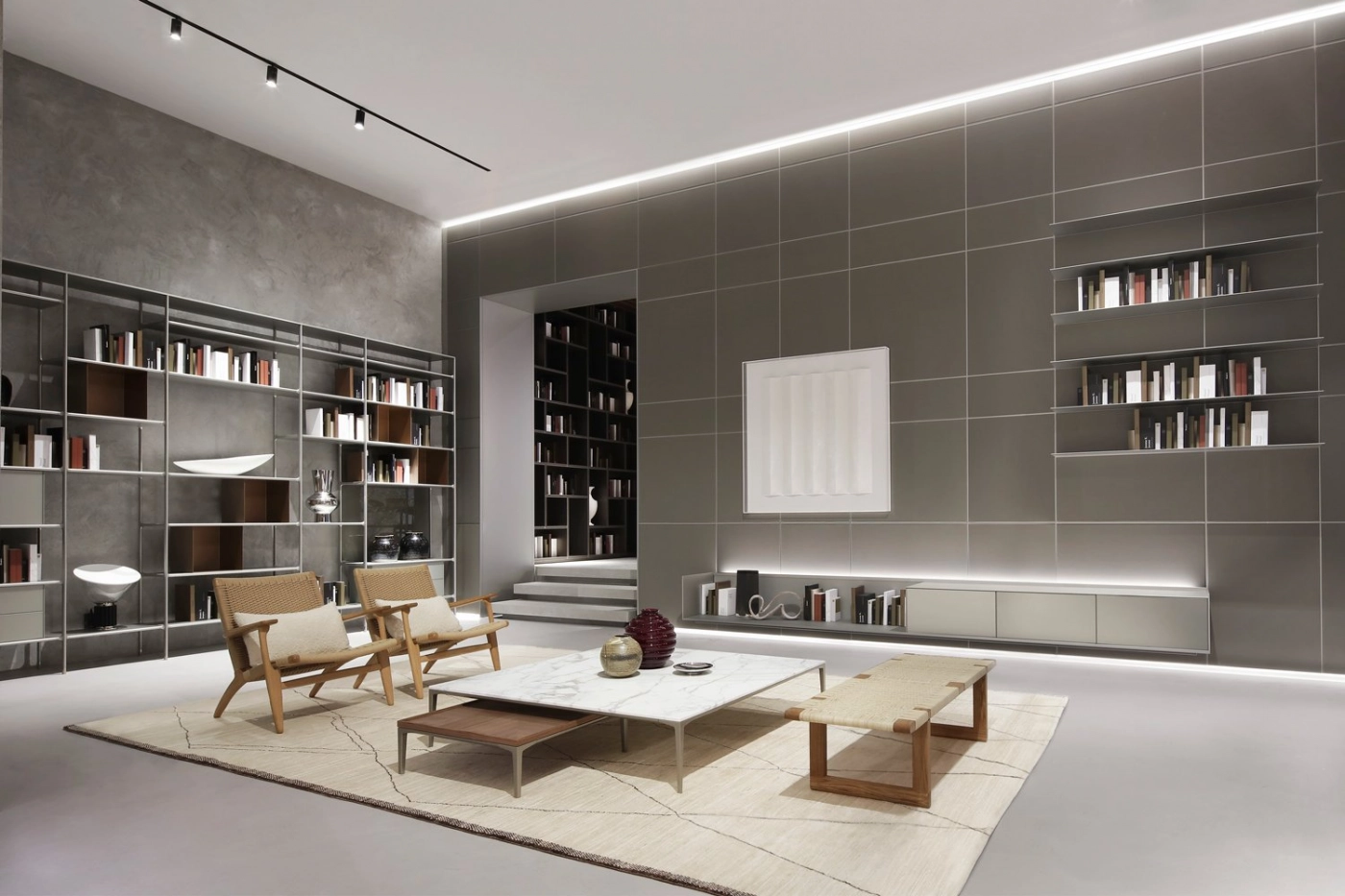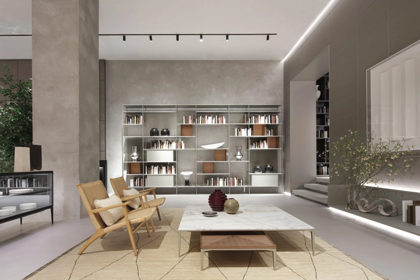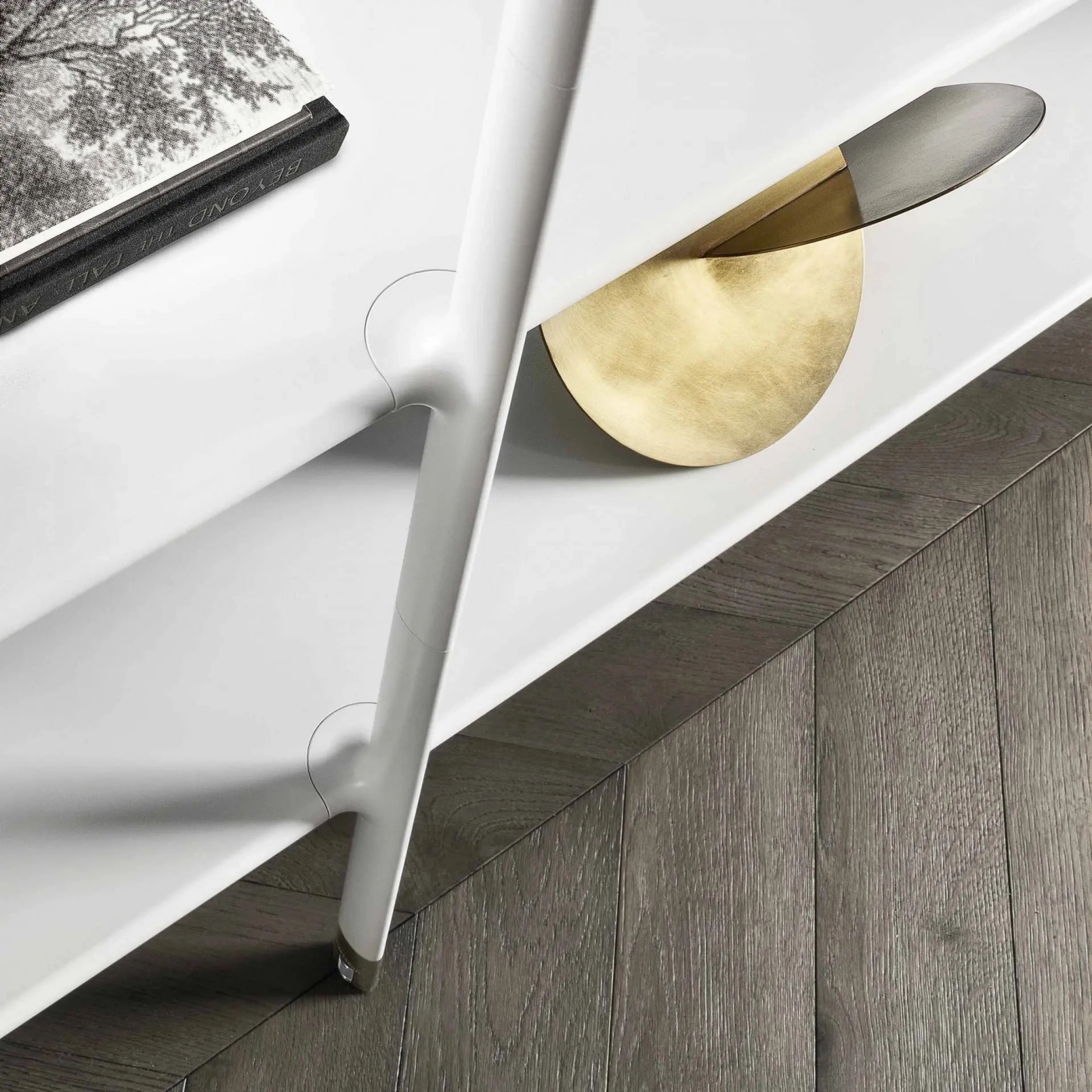 Is the archetype of the bookcase in the new interpretation by Rimadesio: a modular system combining aesthetic lightness and technological innovation.The focus of the project, entirely in aluminium, is represented by the union between extruded shelves and die casting uprights, in central and terminal versions. Vertical modularity of Wind is obtained by the connection of nylon fibre joints inserted into the uprights which grant the maximum stability. Closing element of each composition is the laminated lacquered mdf top, covered by a double aluminium plate.