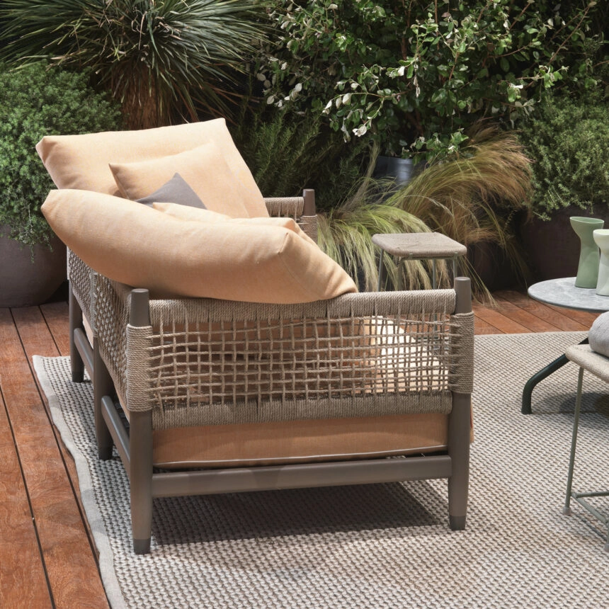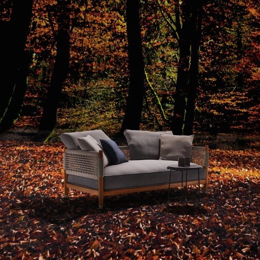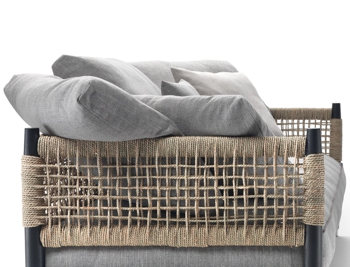 The retro influence in the Parker Outdoor sofa is clear. Its graceful lines, the natural wovens and artisan craftsmanship are proof of the savoir faire Flexform is known for.The structure of the Parker Outdoor sofa is made of steel and solid hand-turned and finished wood. Also entirely hand-made is the finely woven material featured on the backrest and armrests. There is a single seat cushion, while large, generously padded loose cushions lean against the cord backrest. The final part of the legs is finished with die-cast metal alloy tips and protective nylon pads. The Parker Outdoor family includes two- and three-seat sofas, an ottoman and an element with a backrest and just one armrest that allows the creation of unique arrangements.