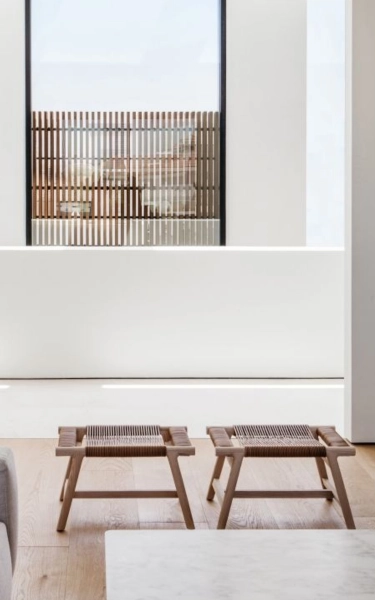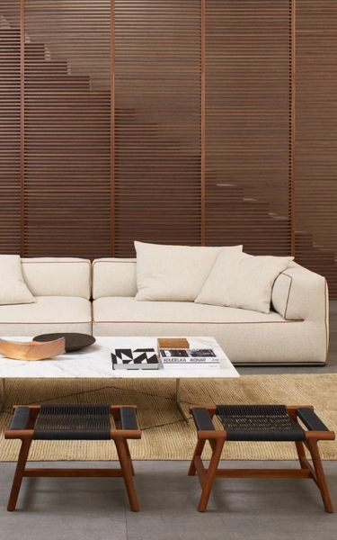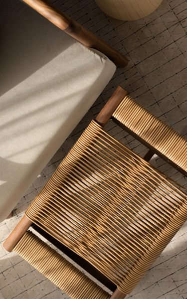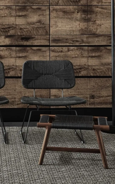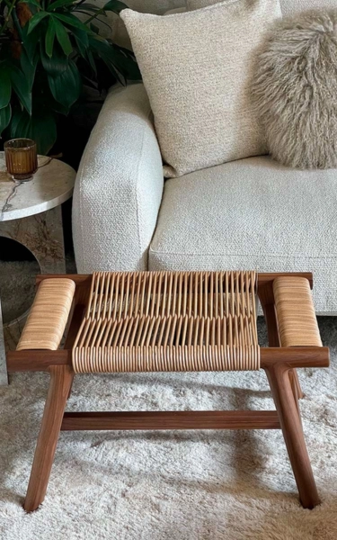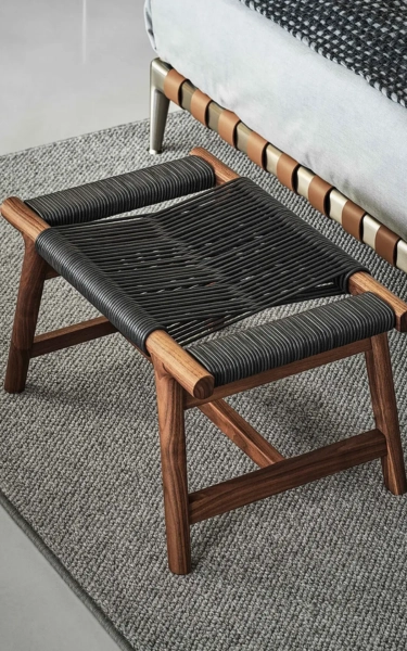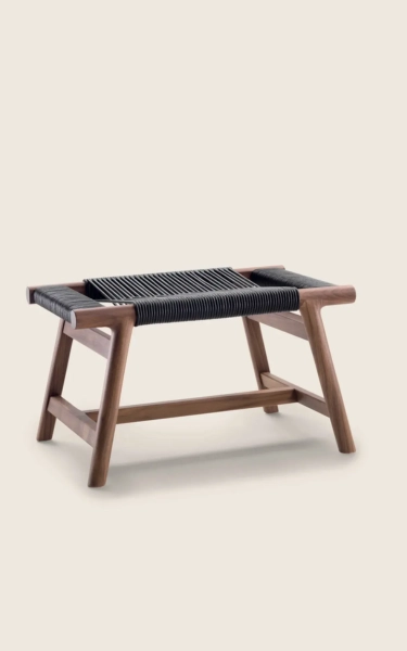 This modestly-sized ottoman has a big personality. The aesthetic integrity of the design is enhanced by craftsmanship skills steeped in the cabinetmaking tradition. The elegantly-flared lines of the ottoman’s structure – made entirely of solid wood, available in an array of stain colors – lend the ottoman an exceptional air of visual lightness. As unique as it is sophisticated, the top is entirely hand-woven in a masterful design made from cowhide cord. The Giano ottoman is a captivating and functional piece that serves as a handy accessory to round out the living room decor.
