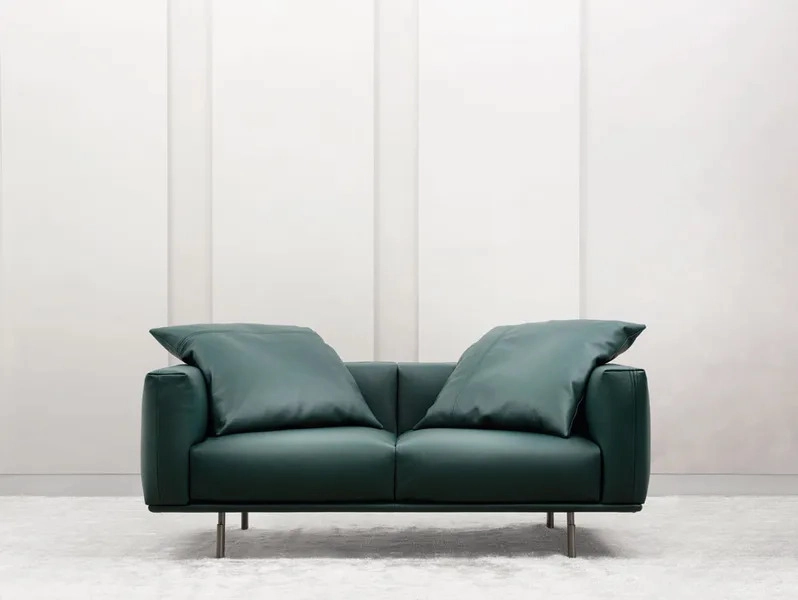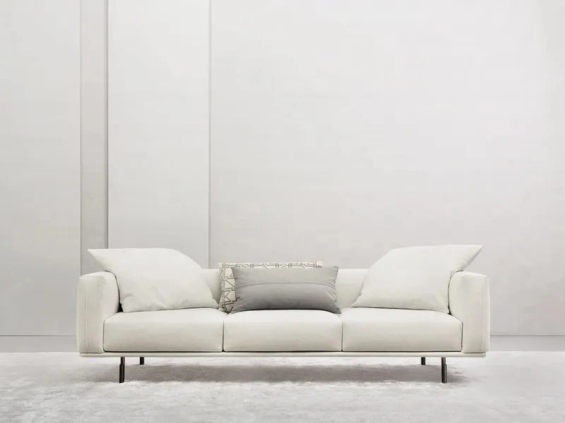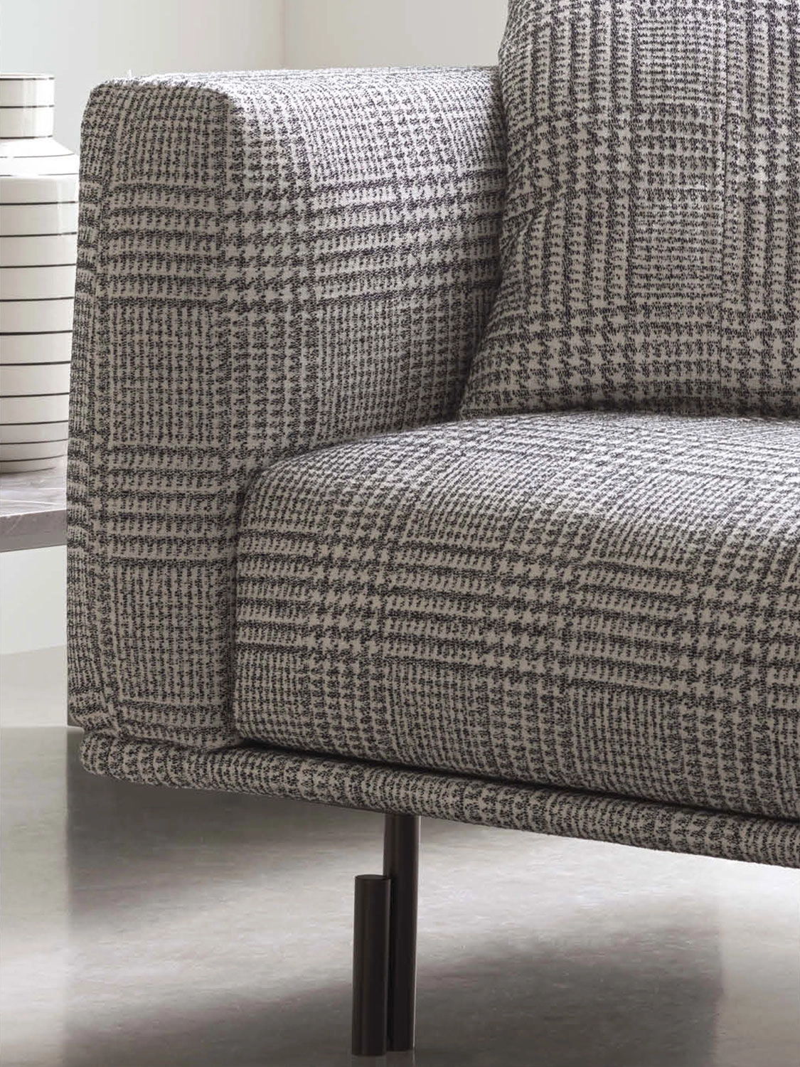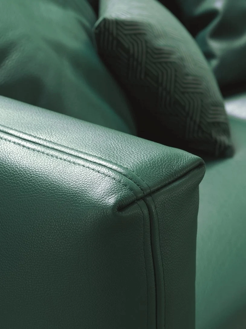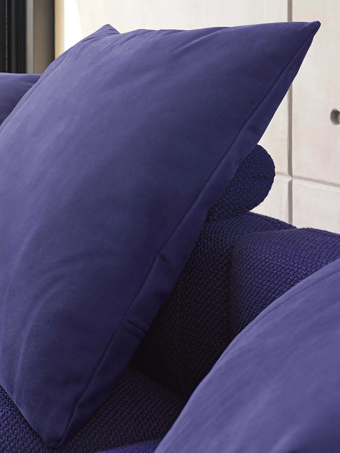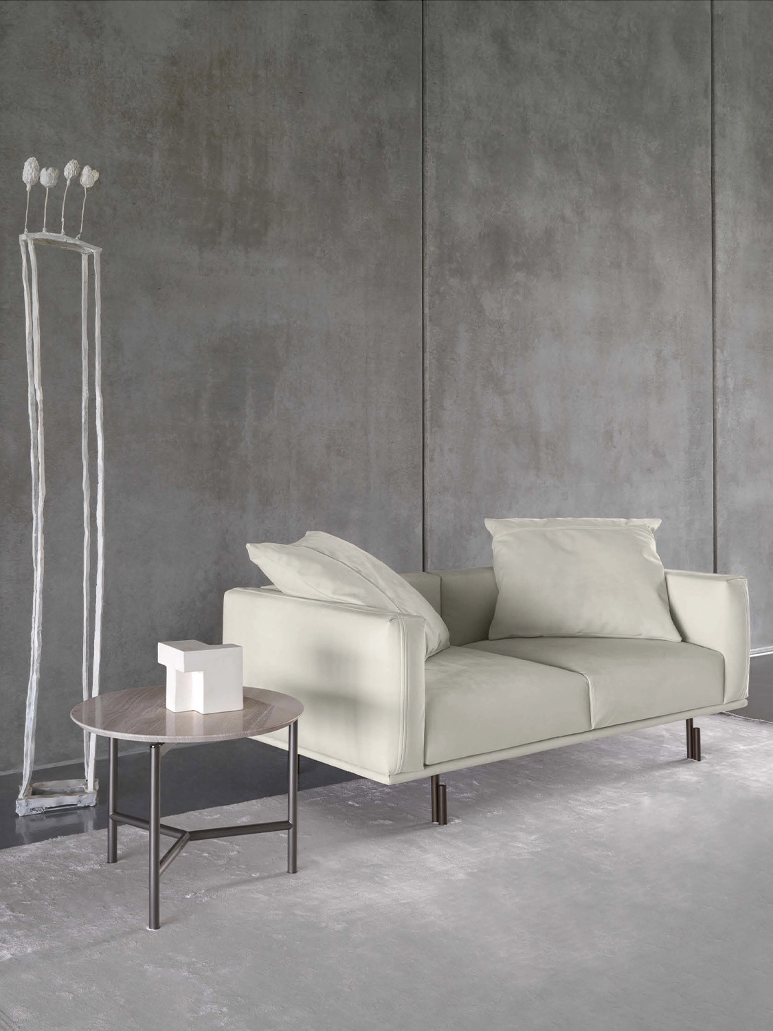 The clean, modern and light lines are underlined by the double feet in matt burnished finish that raise it from the ground. Large feather cushions, that repeat the relief stitching of the sofa’s armrests, give the composition a distinctive, elegant appearance. A clever accessory to support the backrests, that can be moved and positioned on each element, increases the support height, offering perfect comfort for each type of seating.