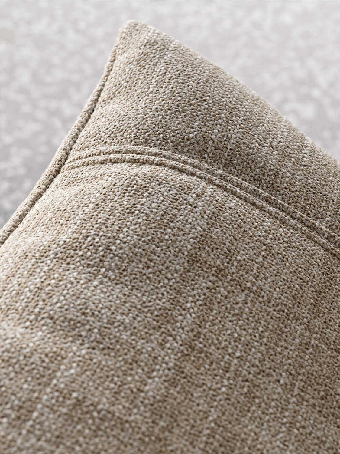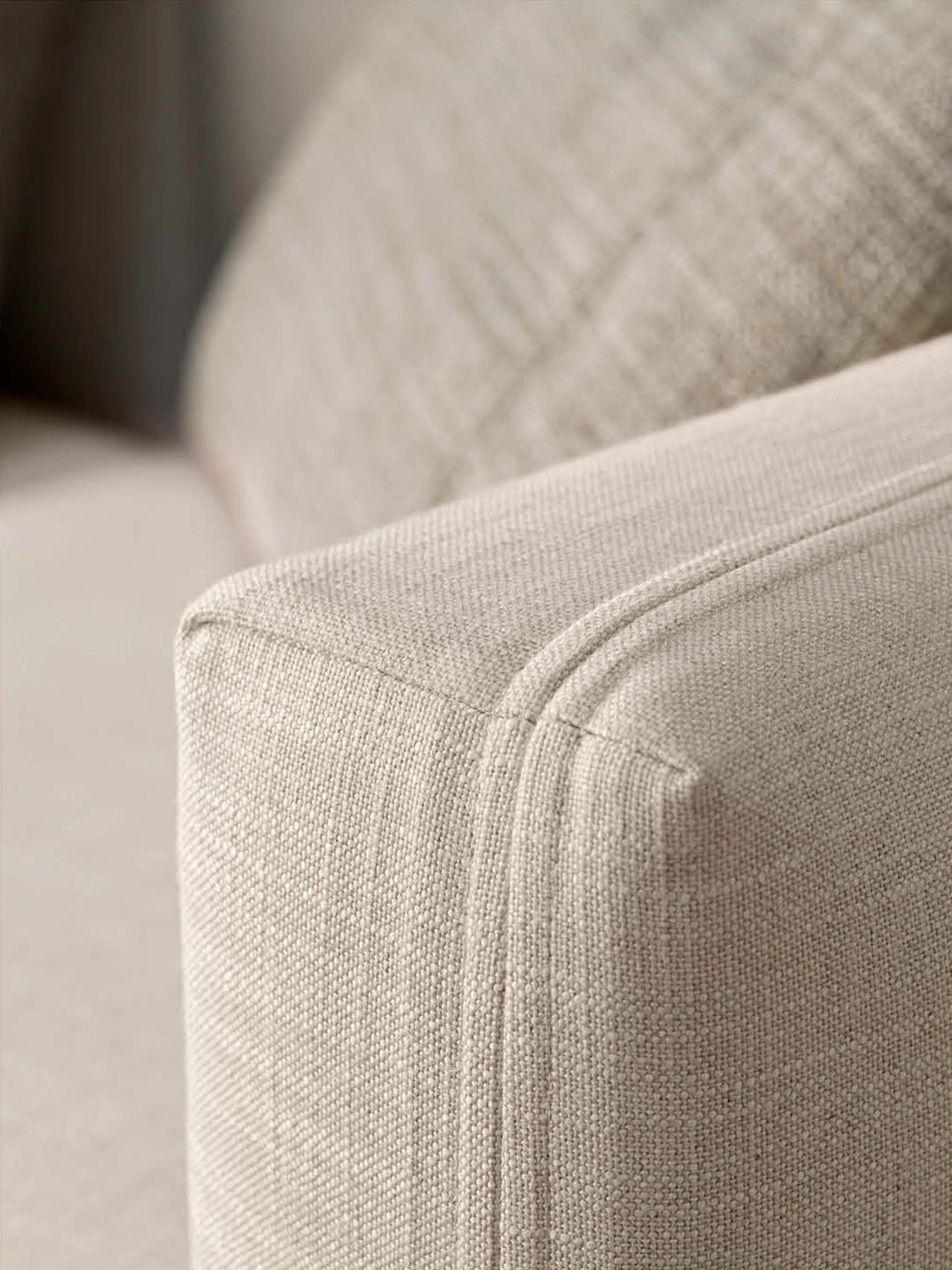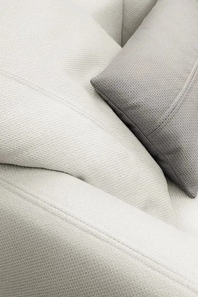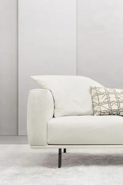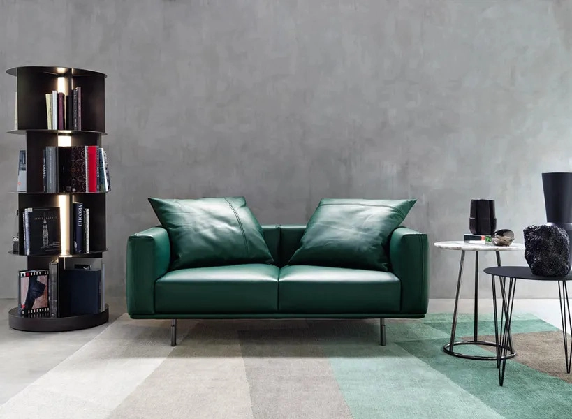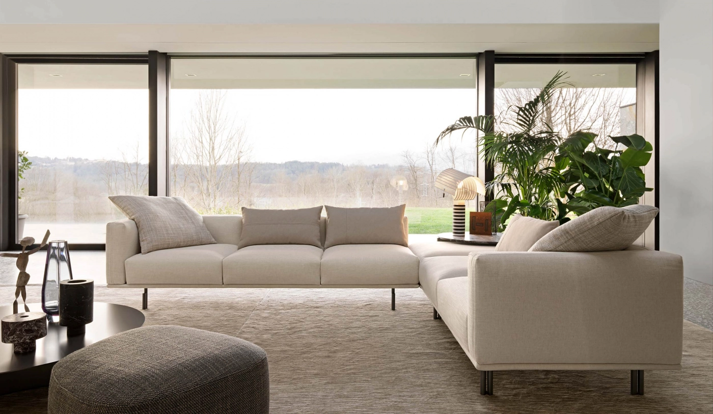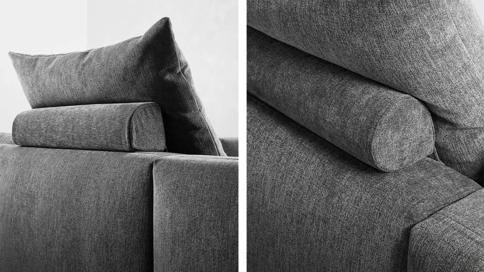 The clean, modern and light lines are underlined by the double feet in matt burnished finish that raise it from the ground. Large feather cushions, that repeat the relief stitching of the sofa’s armrests, give the composition a distinctive, elegant appearance. A clever accessory to support the backrests, that can be moved and positioned on each element, increases the support height, offering perfect comfort for each type of seating.