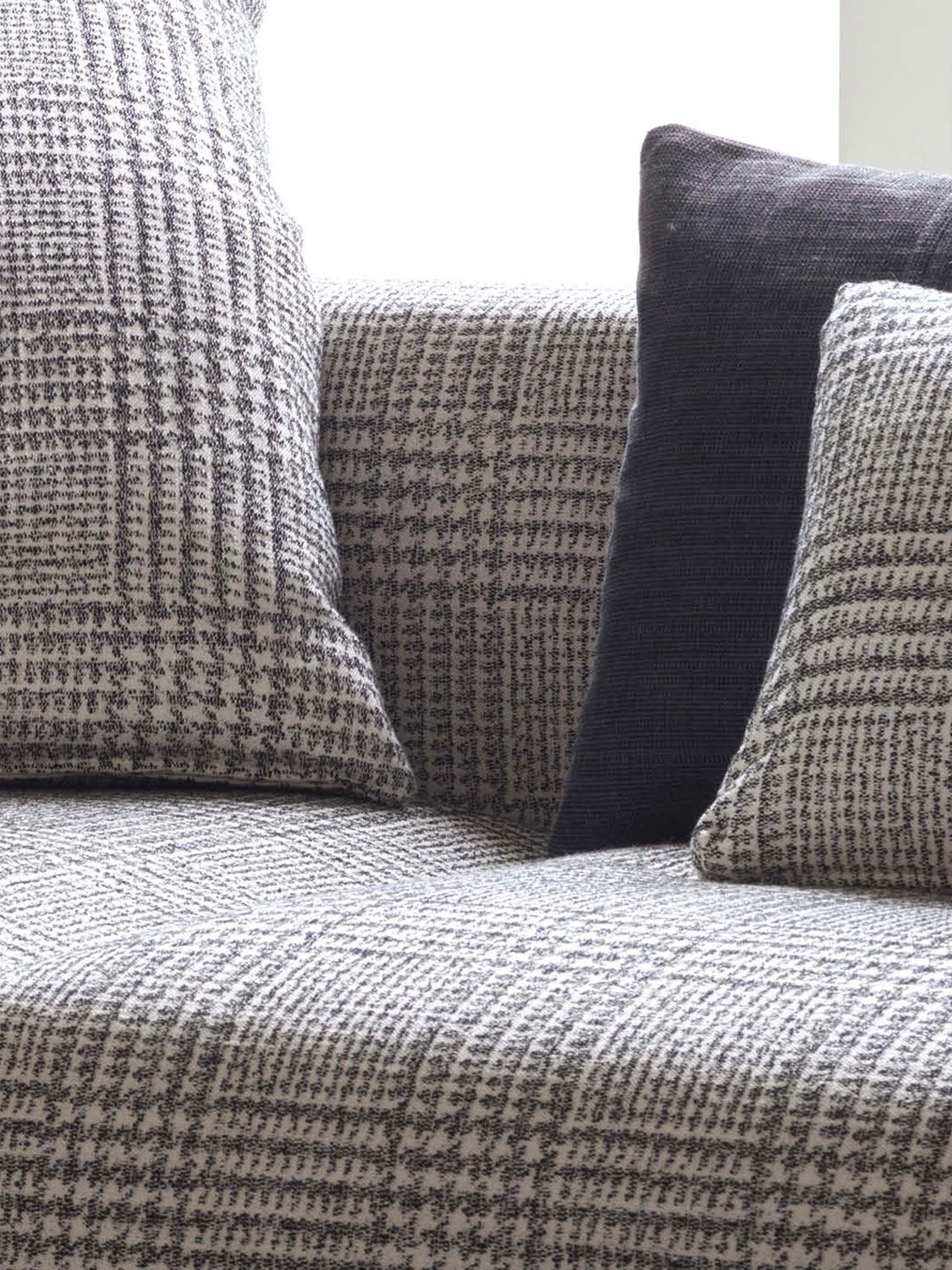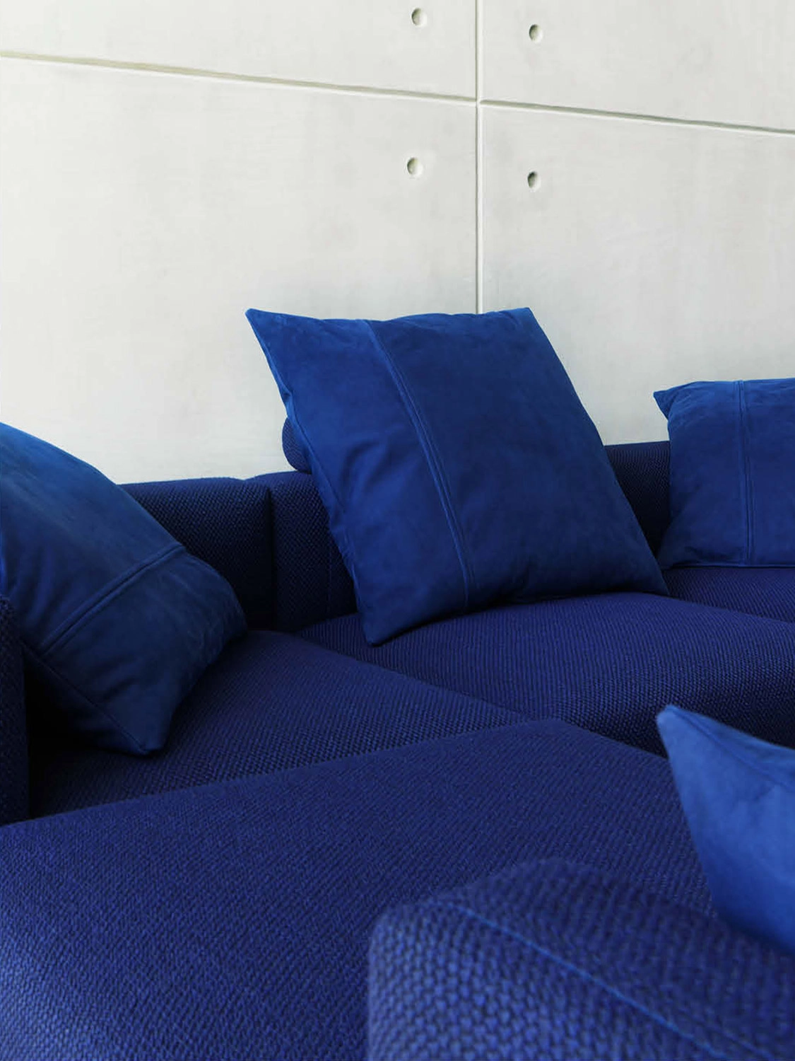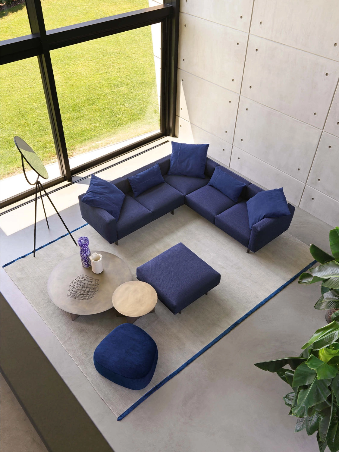 A sofa with a sober line and a simple modularity, versatile and ideal for the workplace, public spaces, unconventional and dynamic living spaces. The two- or three-seater elements with one or two armrests and the two large square poufs are interchangeable: seatings and poufs separate, they are assembled and re-assembled to create arrangements that are always new and design the spaces to suit every necessity.
