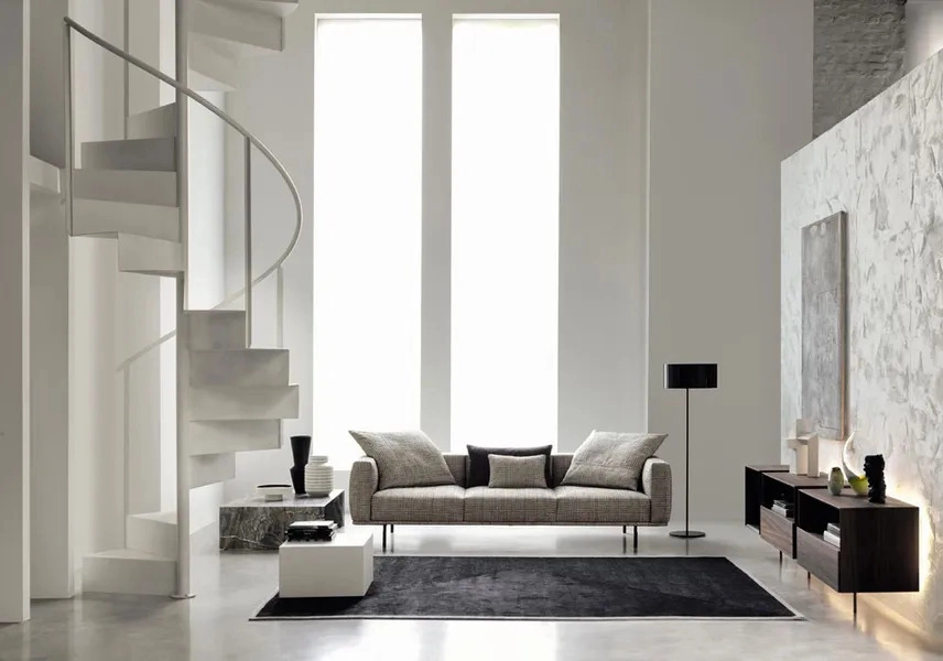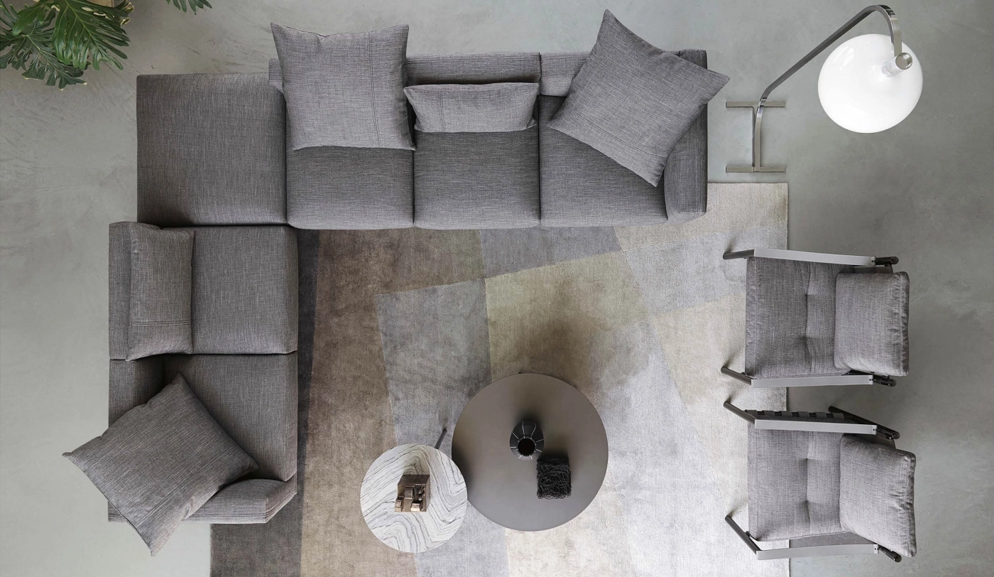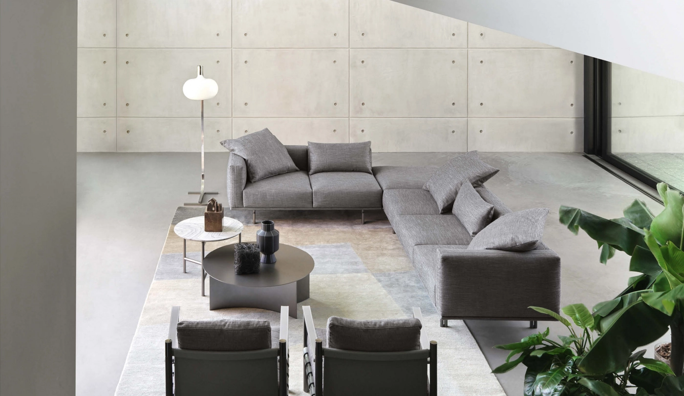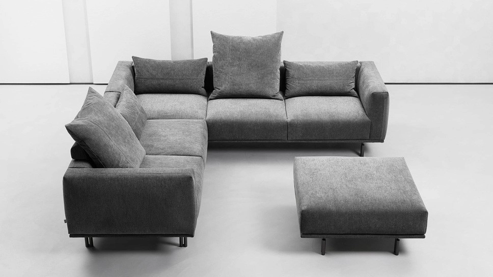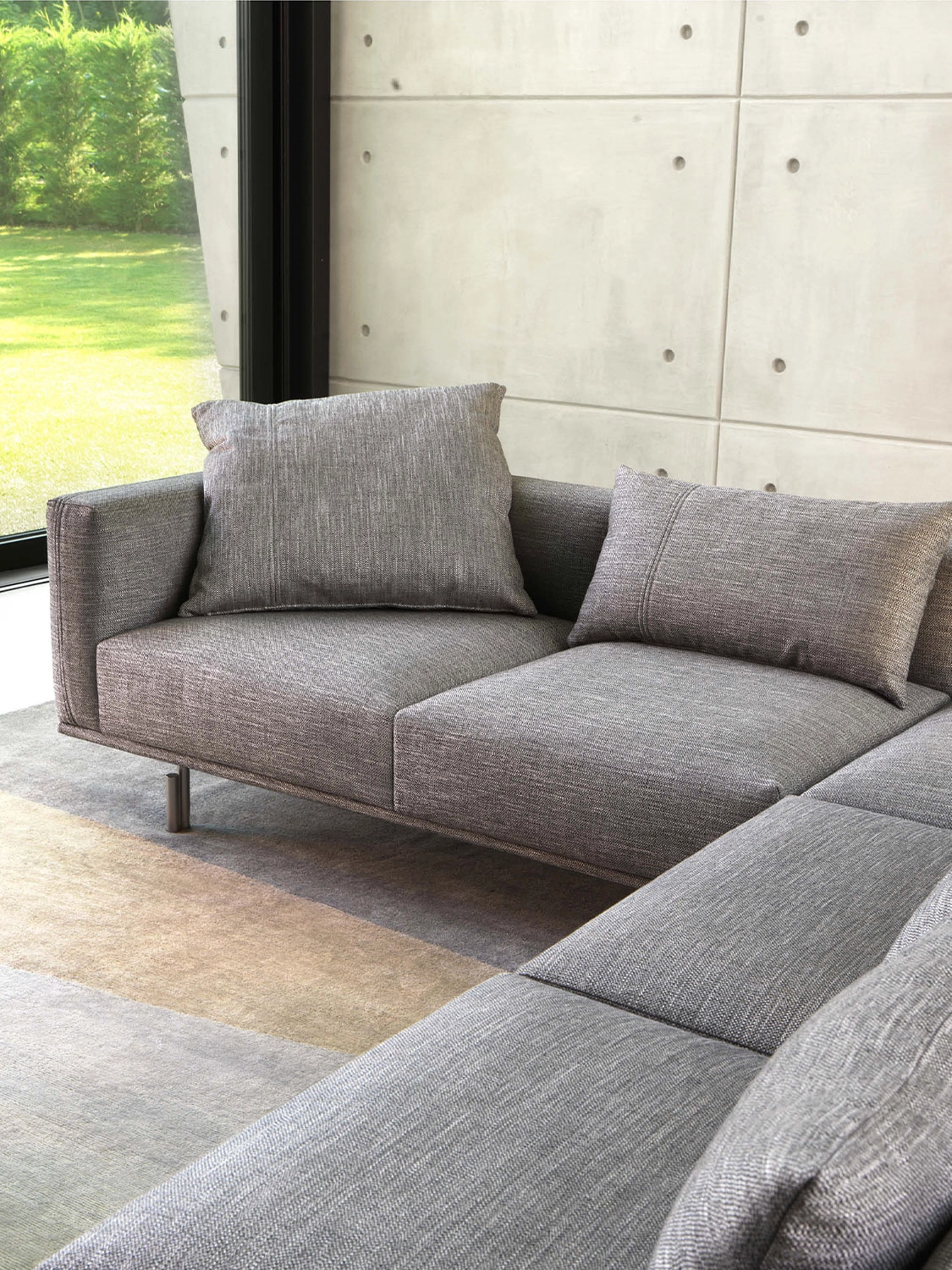 A sofa with a sober line and a simple modularity, versatile and ideal for the workplace, public spaces, unconventional and dynamic living spaces. The two- or three-seater elements with one or two armrests and the two large square poufs are interchangeable: seatings and poufs separate, they are assembled and re-assembled to create arrangements that are always new and design the spaces to suit every necessity.