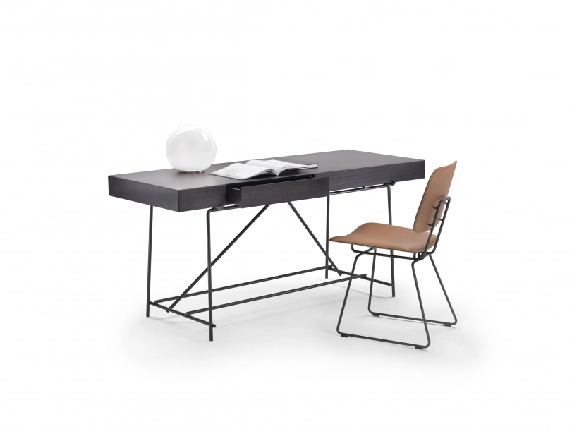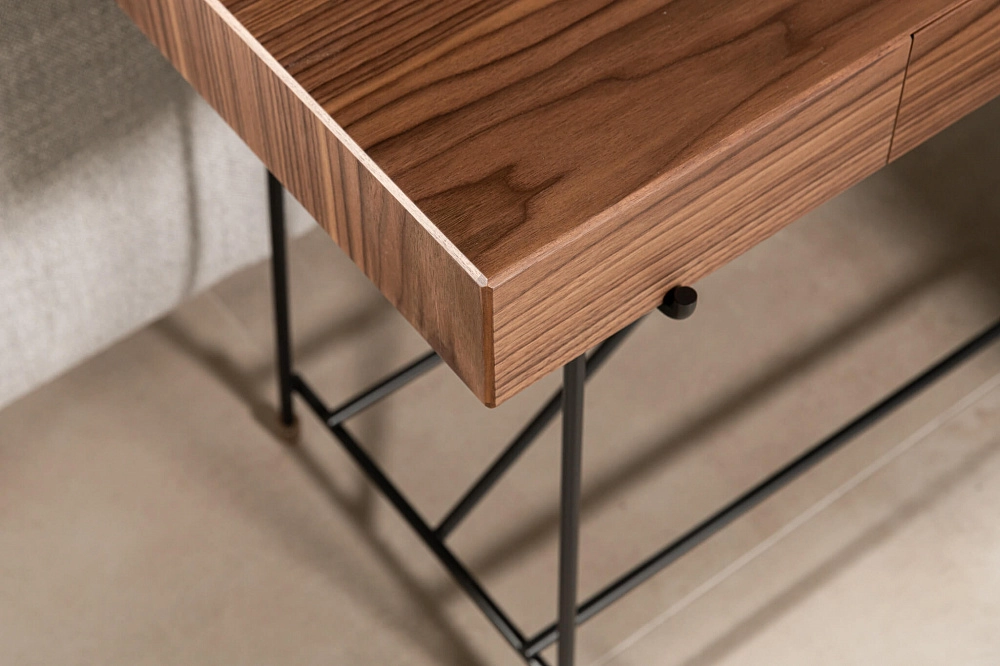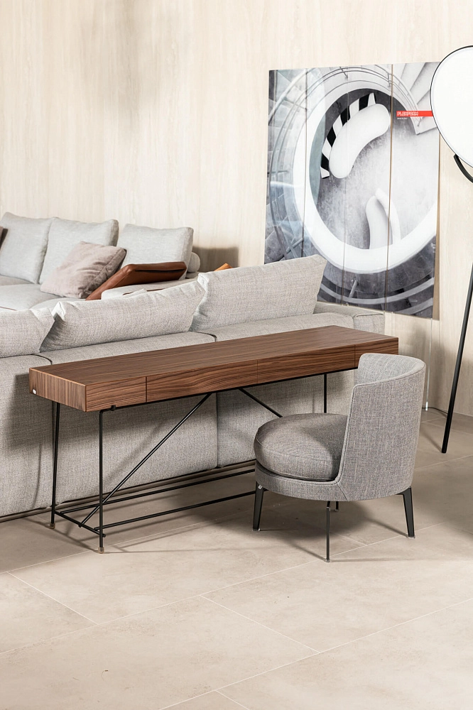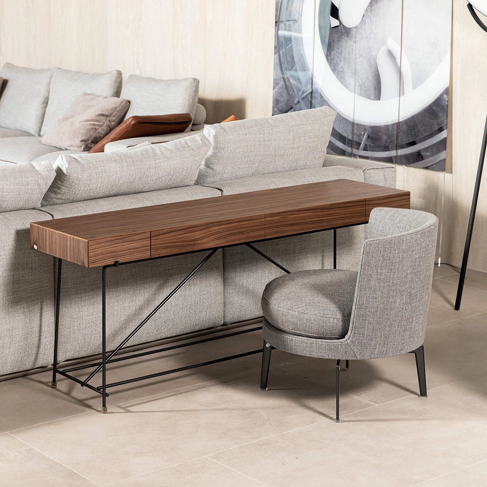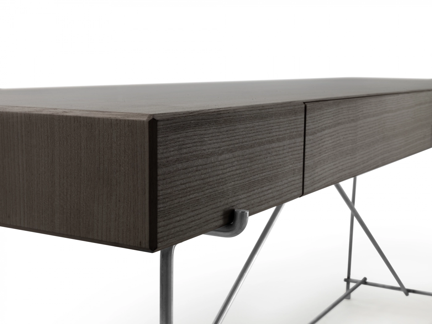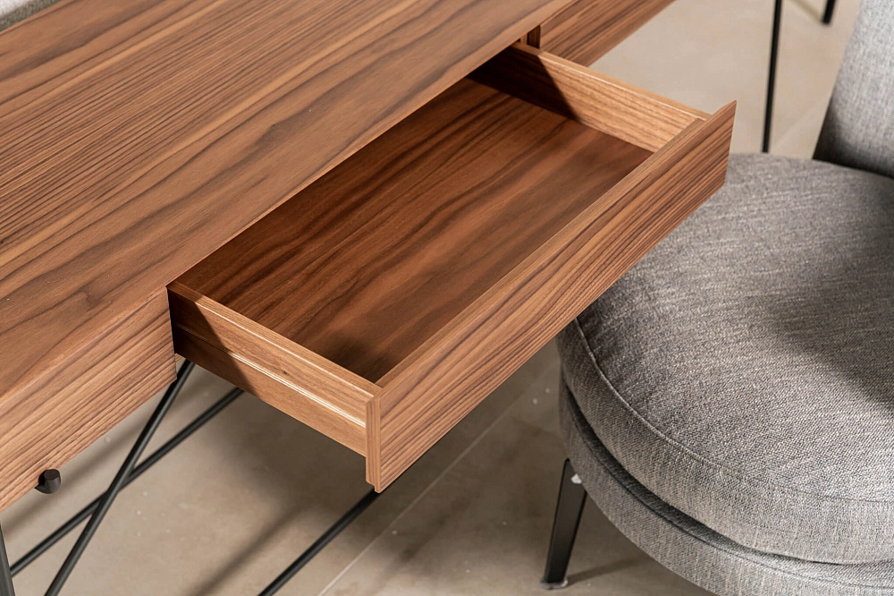 The sleek metal structure supports a Canaletto walnut veneered element, complete with practical drawers, that comes in an array of finishes. The top can be made of wood or in various types of marble.