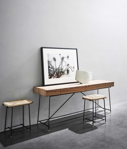 The concept of the Any Day console also extends to a family of coffee and side tables, available in a number of sizes and finishes; and also, an ottoman whose distinctive seat is made of woven paper cord or paper rush cord, natural materials that trace their origin to traditional methods.