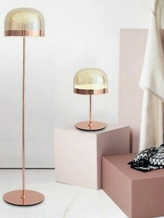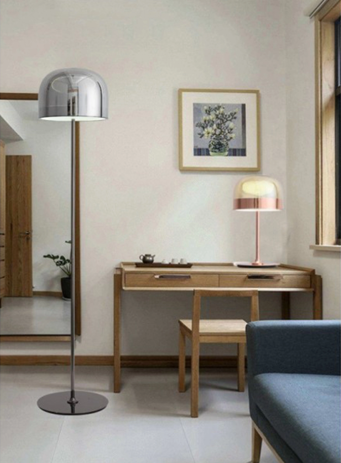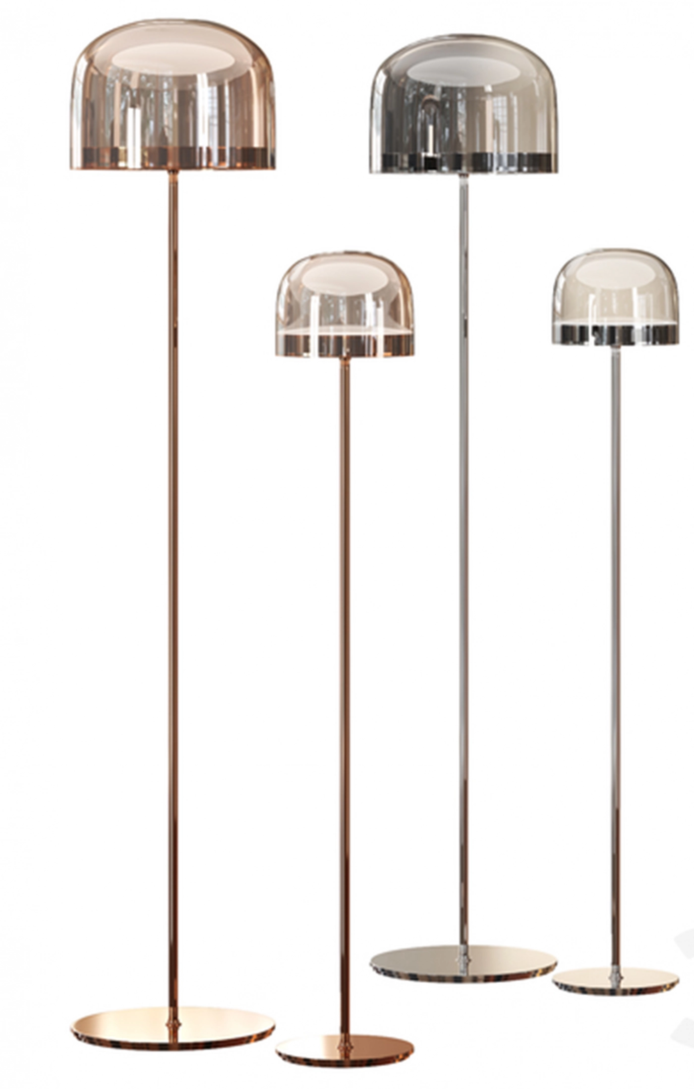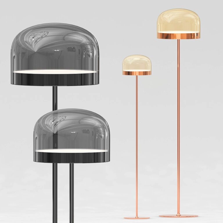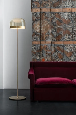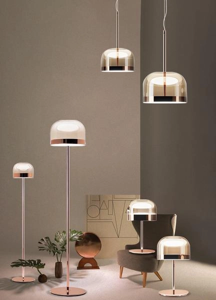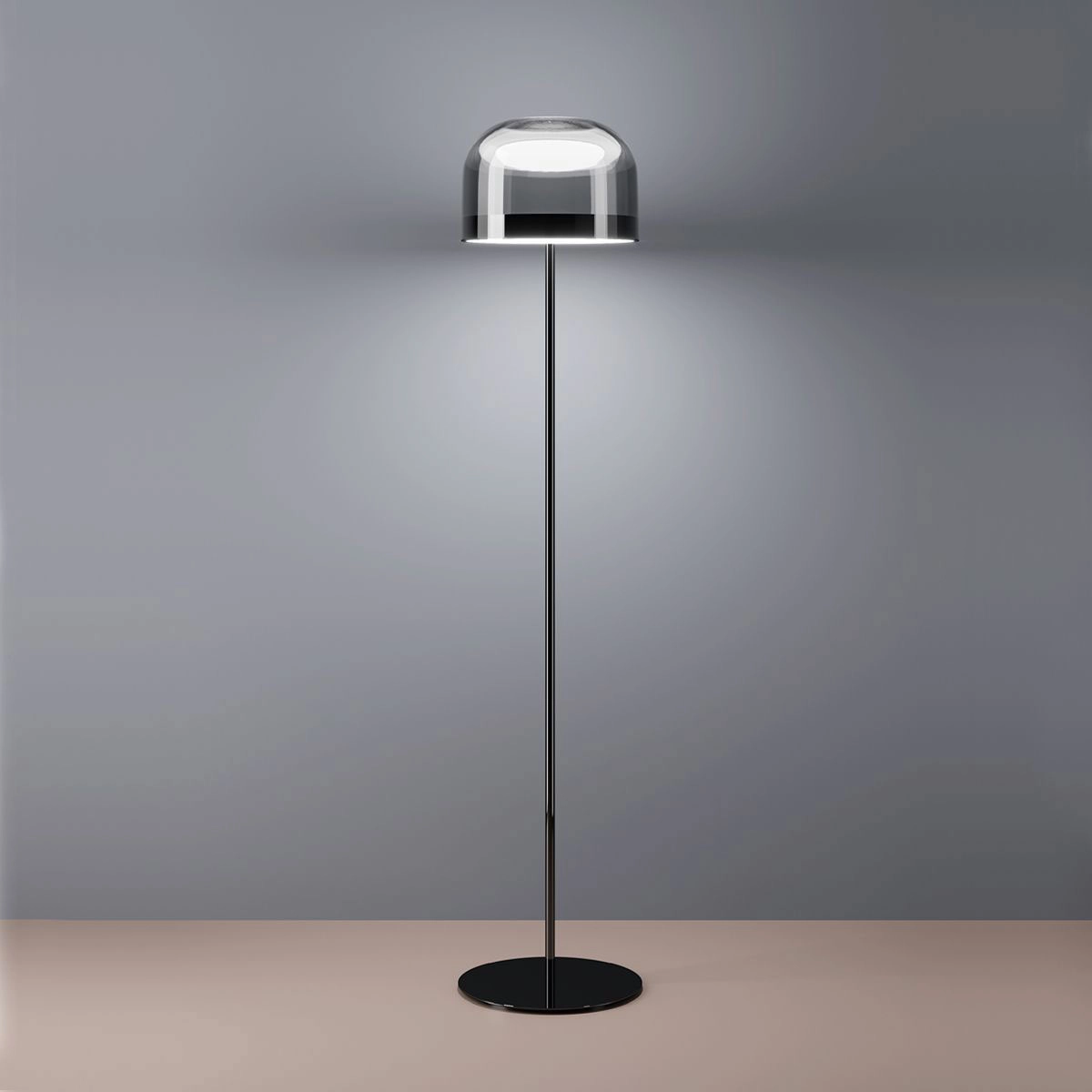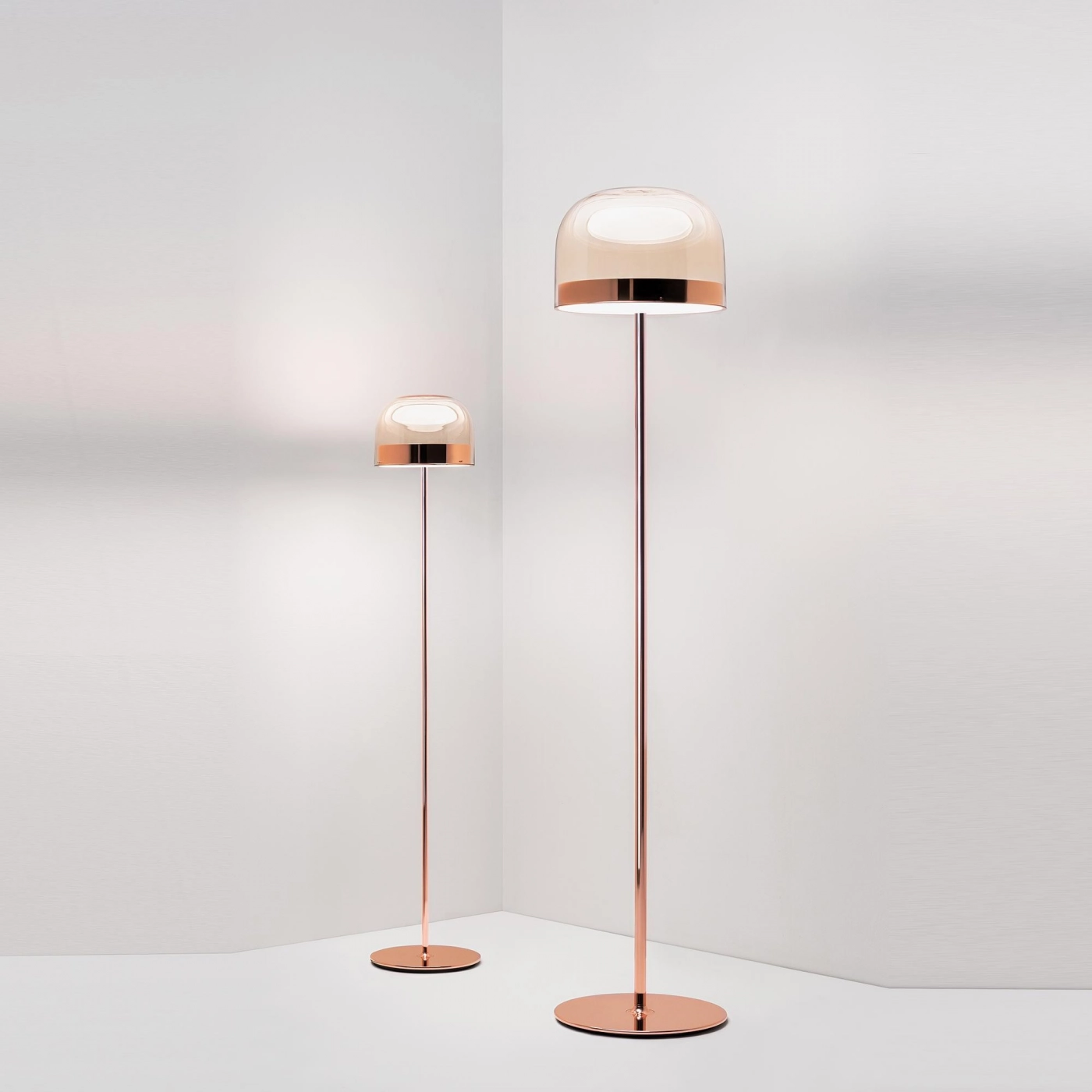 Equatore is a contemporary reinterpretation of the classic lamp with a glass shade. While the traditional abat-jour uses the shade to contain the light source within, in this family of lamps the shade is paradoxically and suggestively empty, with the light being generated by two luminous discs placed inside a central metal band, visible on the shade, that evokes the line of the equator. The light produced by the Leds, thanks to internal screens arranged in layers, is distributed regularly across the surface of the discs, magically illuminating them. The bottom disc directs the light output downward, the upper one illuminates the glass cap for a soft, diffused light. Available in table, floor and ceiling models, in two sizes and two colors: a cooler version in gray with a dark chrome frame, and a warmer version with a transparent dove gray cap and a copper-colored frame.