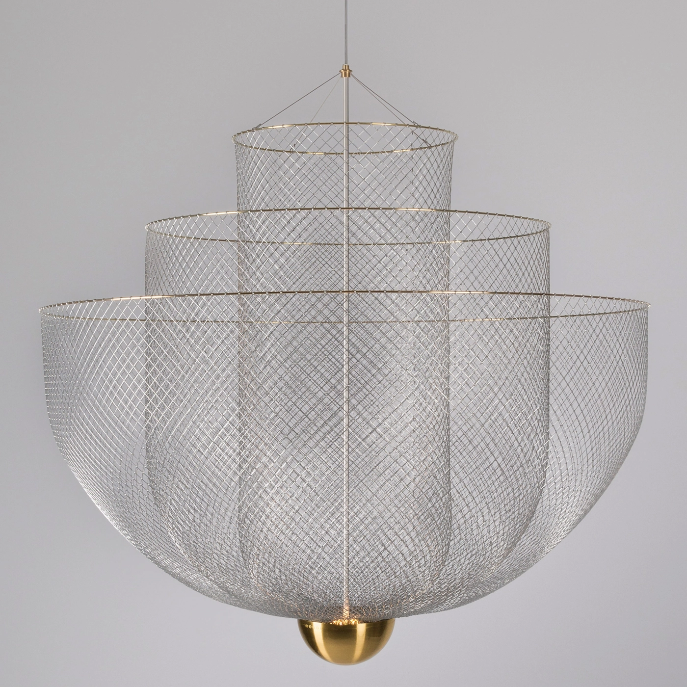 Whoever sets eyes on the Meshmatics Chandelier will never guess what hides behind its sophisticated appearance. Rick Tegelaar elevated the nature of humble wire netting by developing a machine and a set of tools to model it with accuracy. The full potential of this thin and flexible material is stretched and captured within three layers of beauty.