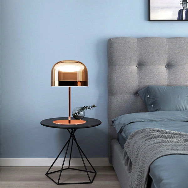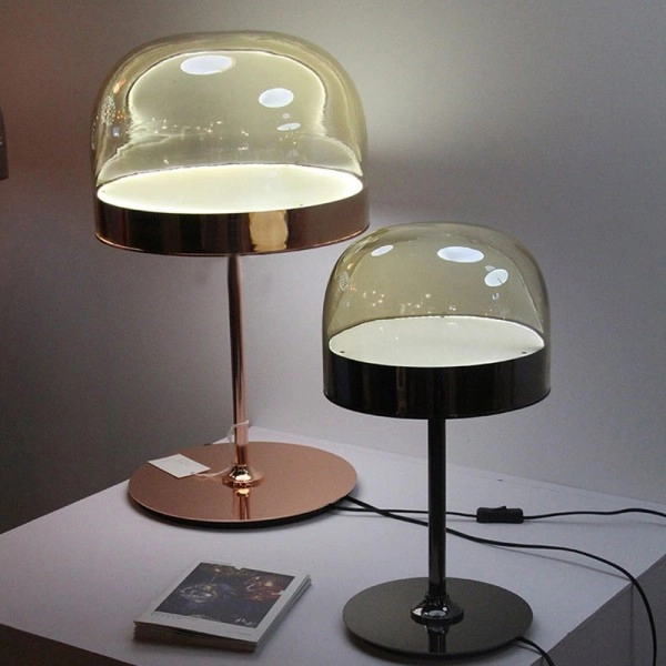Equatore is a contemporary reinterpretation of the classic lamp with a glass shade. While the traditional abat-jour uses the shade to contain the light source within, in this family of lamps the shade is paradoxically and suggestively empty, with the light being generated by two luminous discs placed inside a central metal band, visible on the shade, that evokes the line of the equator. The light produced by the Leds, thanks to internal screens arranged in layers, is distributed regularly across the surface of the discs, magically illuminating them. The bottom disc directs the light output downward, the upper one illuminates the glass cap for a soft, diffused light. Available in table, floor and ceiling models, in two sizes and two colors: a cooler version in gray with a dark chrome frame, and a warmer version with a transparent dove gray cap and a copper-colored frame.