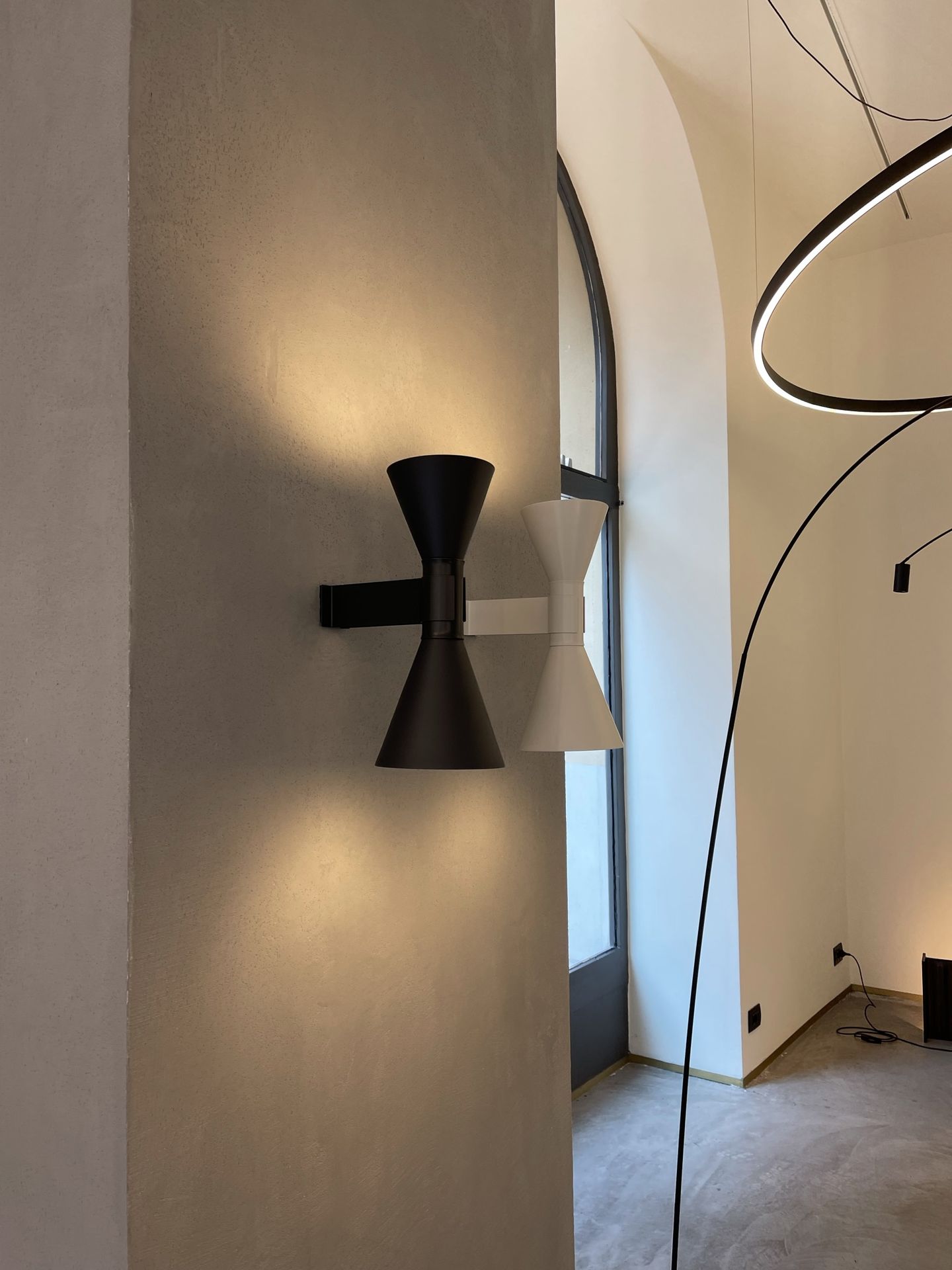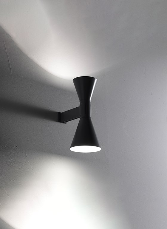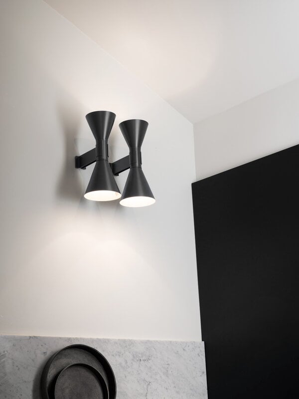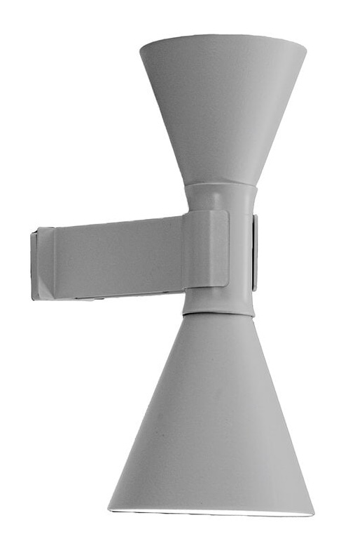 Mini version of the iconic Applique de Marseille Nemo, designed by Le Corbusier for his Parisian flat in Rue Nungesser et Coli. A wall lamp for direct and diffused light: two cone-shaped lampshades direct the light up and down, providing homogenous and sharp light beams. Available in matte grey, whitewash or black finish with an internal white diffuser.