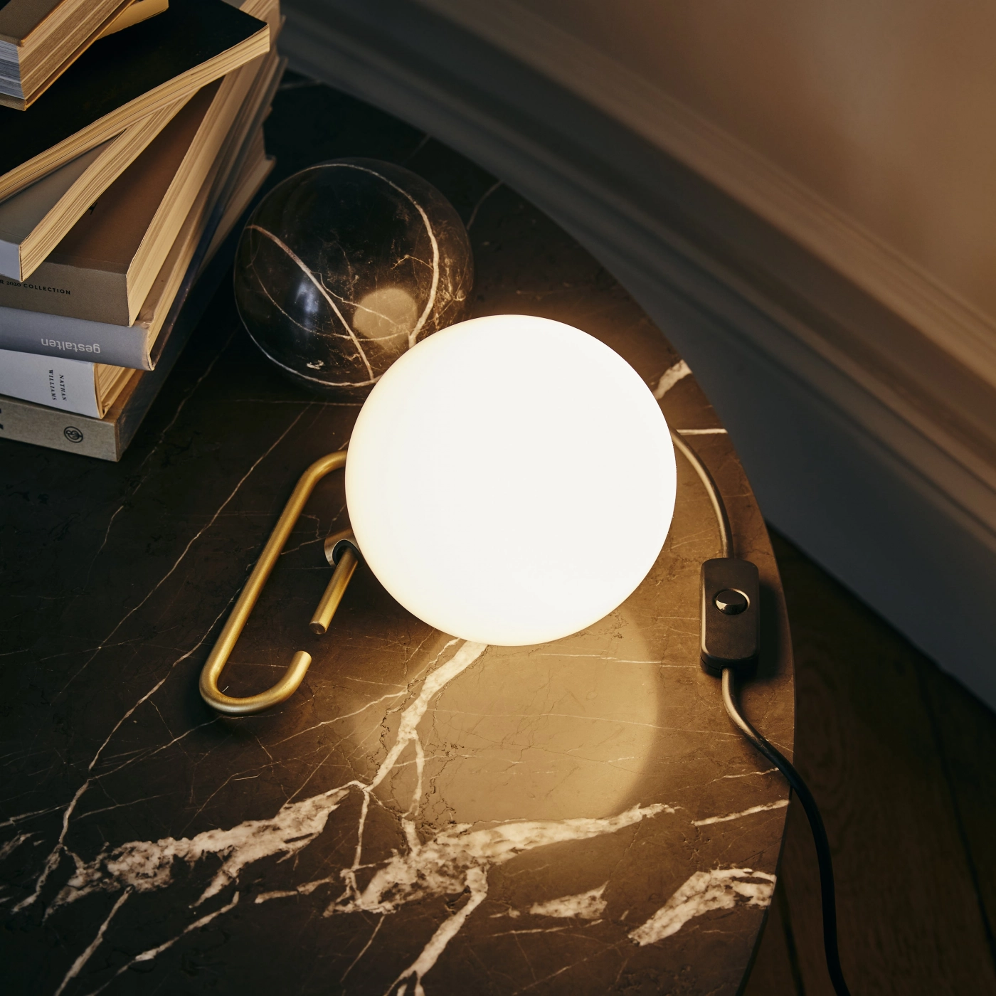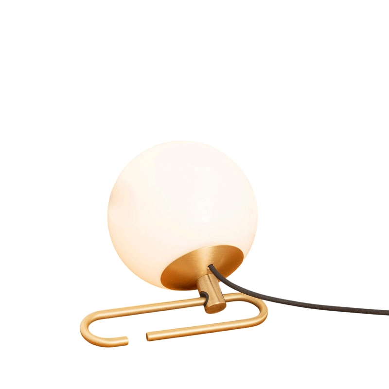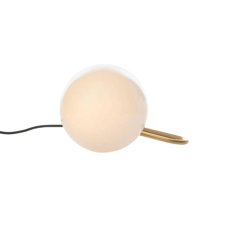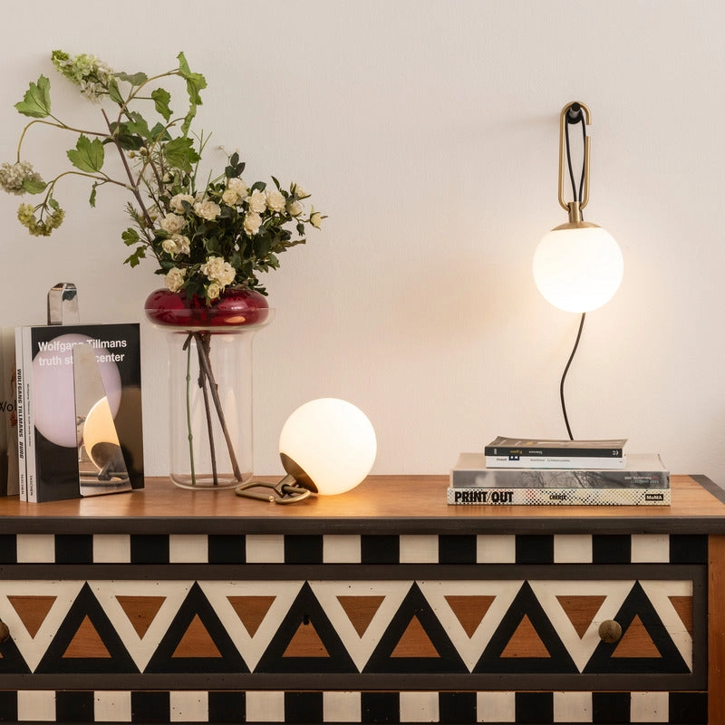 NH1217 is a simple, versatile, practical appliance that can be laid or suspended. A white blown glass sphere slides along a brushed brass ring, which allows it to take different positions and to freely adjust and direct the diffuser. The frame becomes a support, a hook to hang the appliance to the wall, or a handle promoting an interaction with light. nh1217 continues research on the dynamic interaction of experience, details, materials, form, and light that Neri&Hu are pursuing with Artemide. The selected materials represent a perfect combination of tradition and innovation, as well as the expression of responsible and sustainable design, also conveyed by the use of an in-box low-consumption retrofit LED source and by the eco-friendly cardboard packaging.
