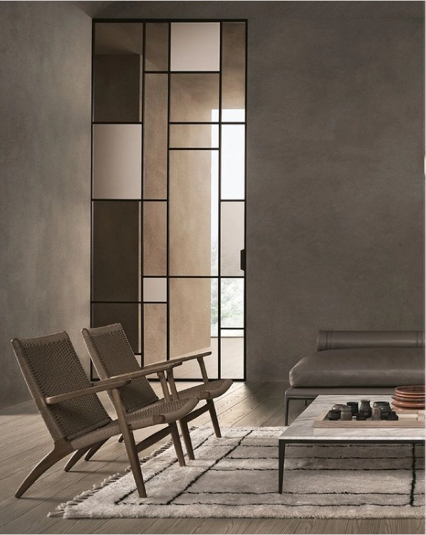 A dividing solution of strong scenographic value, the Maxi sliding system is characterized by an aluminium grid that emphasizes the glass surfaces, giving maximum strength and stability to the structure. The irregular grid pattern enhances the quality of the glass and its veiled transparency. The wide design flexibility allows to create customized compositions, ideal for domestic, professional, hospitality and retail contexts.