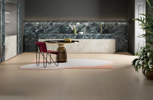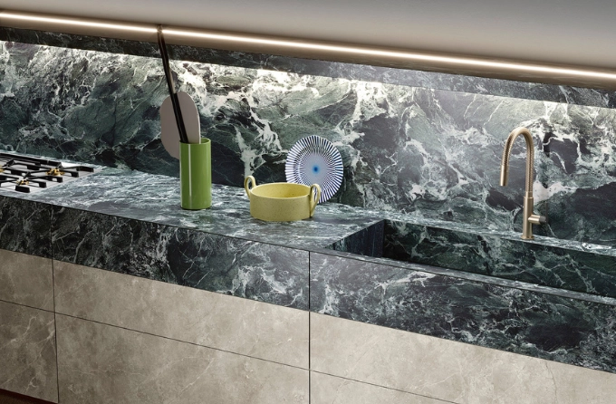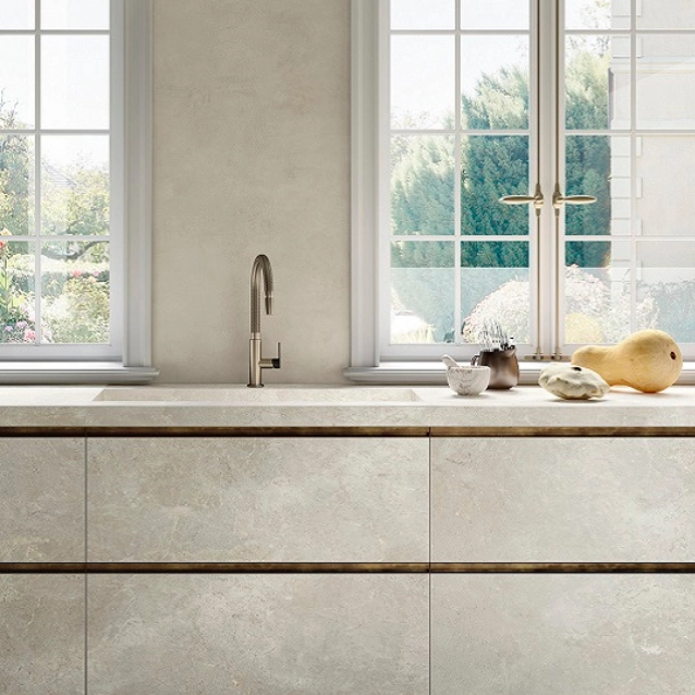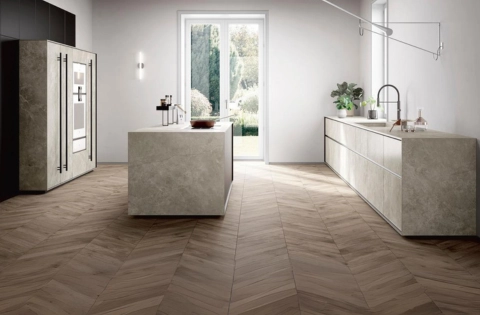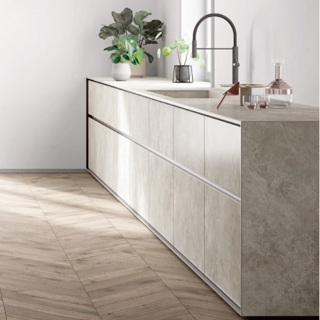 Simple yet elegant, Fior di Bosco features a gray background lightened by subtle white veining and a cloudy effect which softens the transition from one gradation to another.