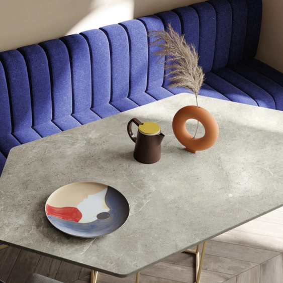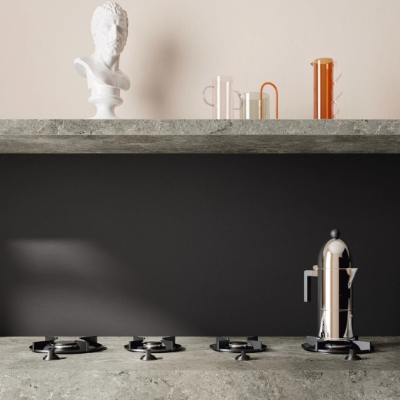 A supremely elegant yet warm ambiance with a retro touch, accentuated by the choice of contrasting materials for base and surfaces, such as Palladium Grey and Noir. The result is a welcoming, warm and bright room where you can enjoy a few moments of pleasant relaxation. Here and there splashes of color add vibrant warmth to joyous elegance, without ever sacrificing practicality. A comfortable sofa provides a well-deserved resting place after a hectic day at work.